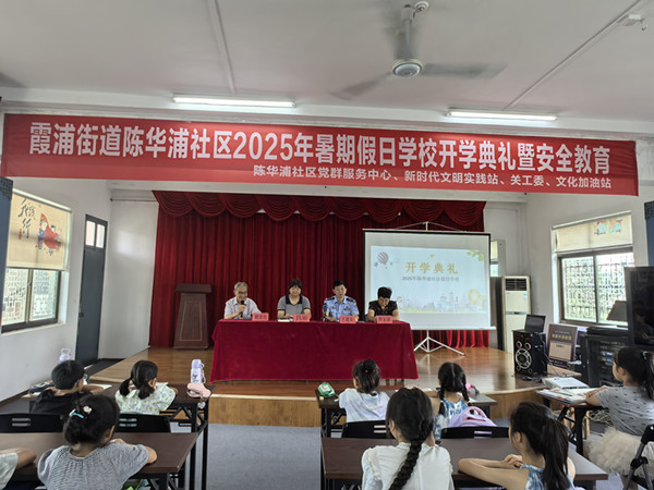 7月8日上午,陈华浦社区在文化礼堂开展暑期假日学校开学典礼。社区党群服务中心副书记吕丽辖区民警王建英、“五老”志愿者戴源鑫和李友娣出席本次开学仪式。开学仪式上,大家先后致辞,对小朋友们致以美好的祝愿,希望小朋友们能在假日学校度过一个愉快且有意义的暑假。