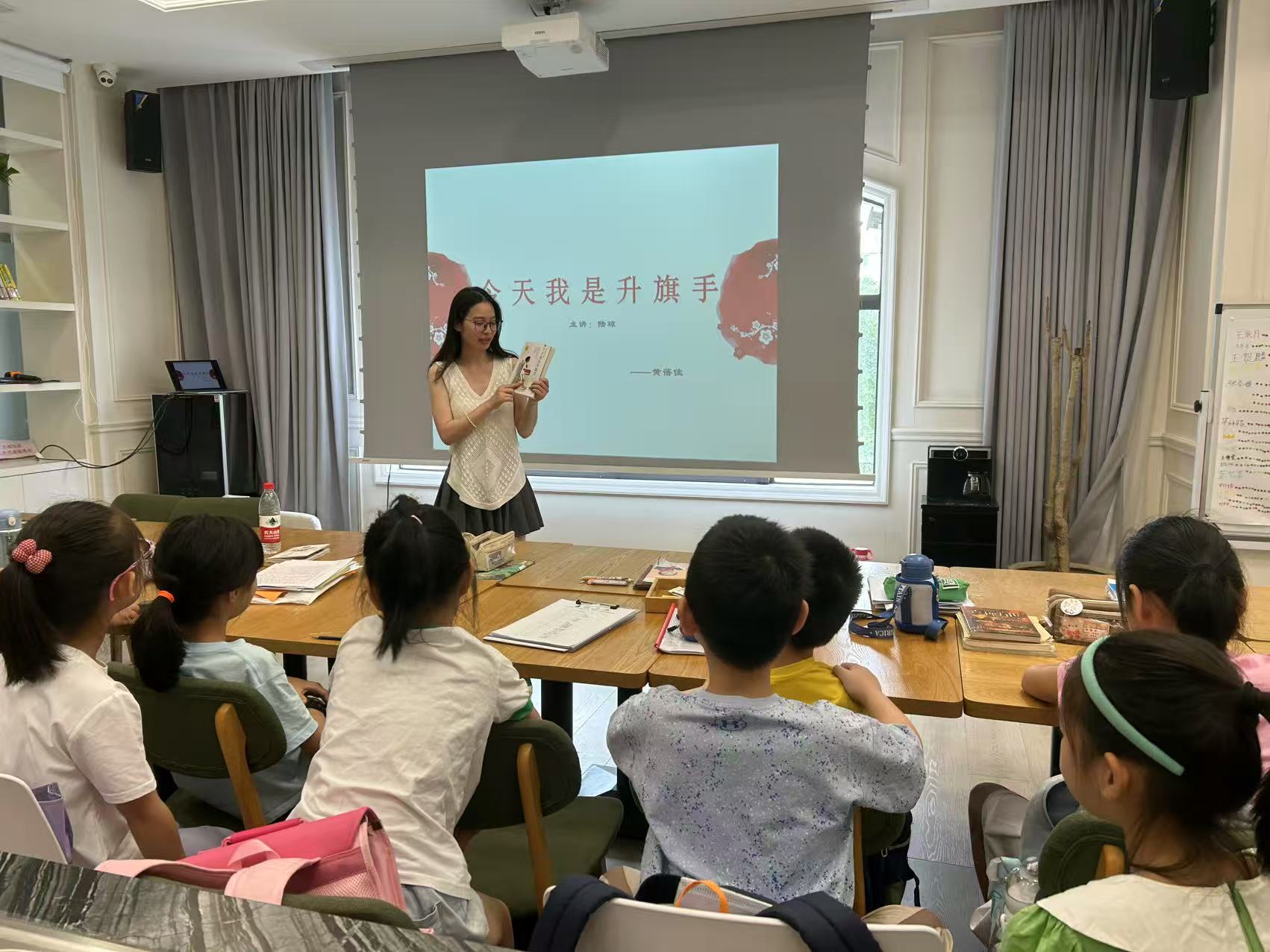 为深入推进爱国主义教育,引导青年学子在阅读经典中感悟家国情怀,7月14日上午,宁波工程学院外国语学院团委书记陆琼以“经典伴读”的形式,为大闸社区暑期托管班的学生们深度解读黄蓓佳经典儿童文学作品《今天我是升旗手》。