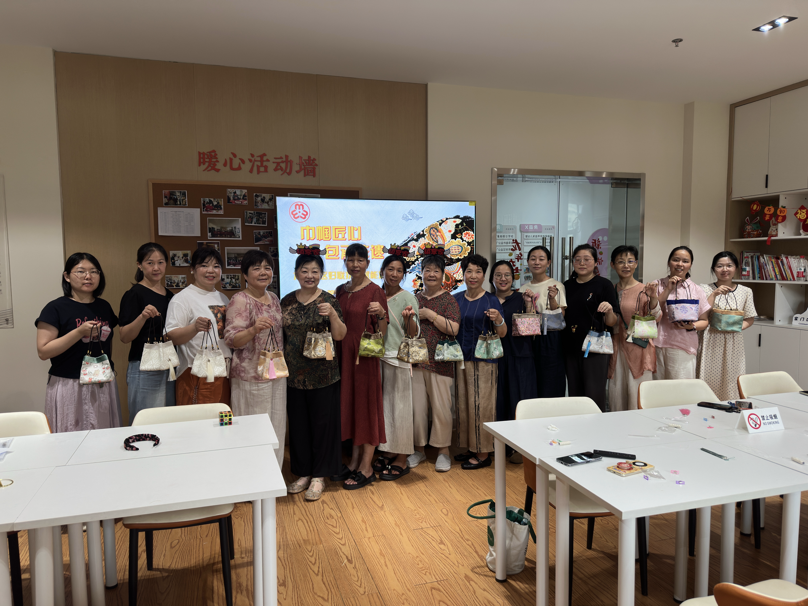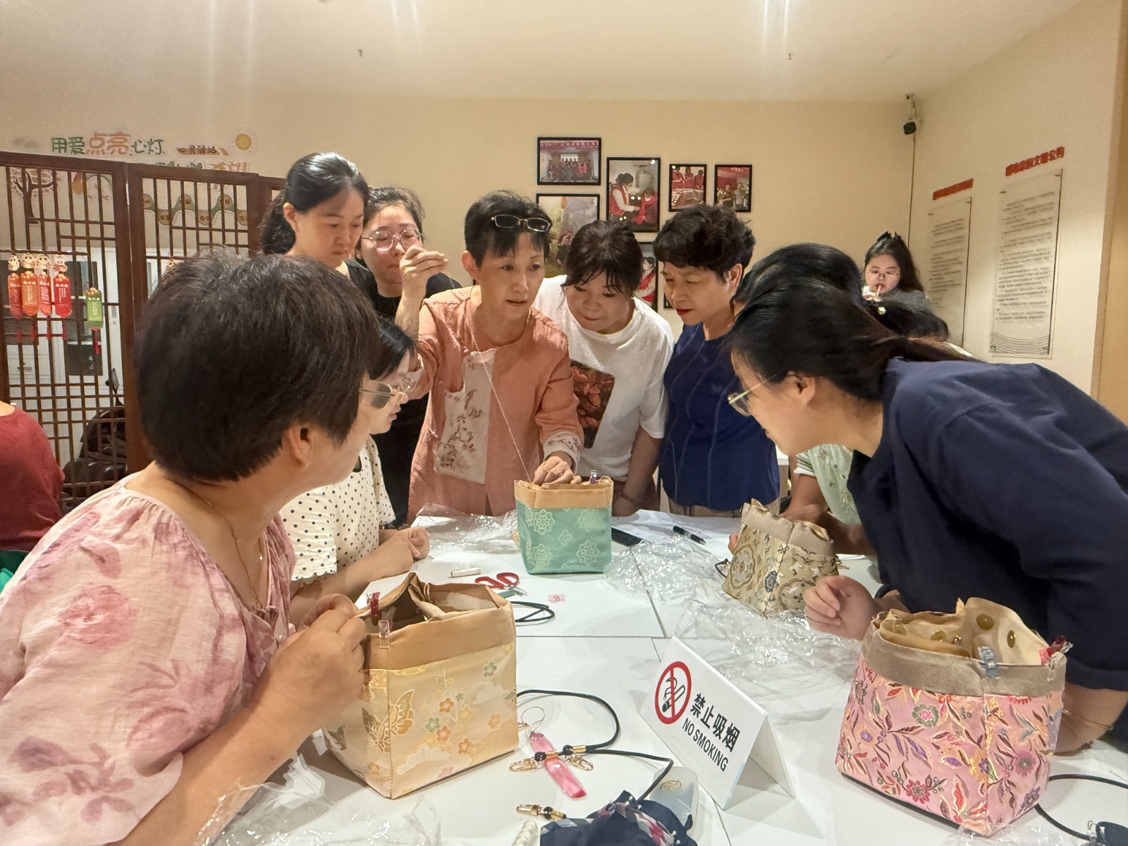 现场,执委和志愿者们围坐在一起,穿针引线、裁剪缝合,在胡老师的指导下,将传统纹样与现代审美结合,亲手制作出一个个独具特色的布艺包。大家不时交流技巧,分享心得,活动室里充满了欢声笑语。