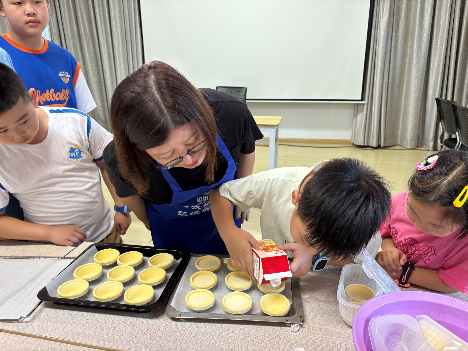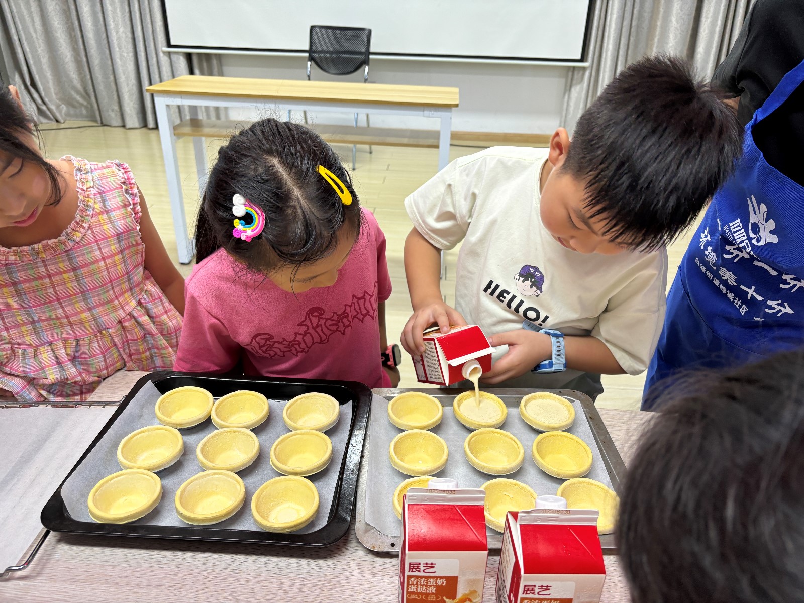 活动开始,社区志愿者将准备好的鸡蛋、牛奶、白糖、蛋挞皮、烤箱等需要用到的食材、工具和蛋挞制作流程为大家进行讲解和示范,孩子们按照志愿者的示范过滤蛋清、搅拌蛋液,再倒入牛奶和白砂糖,然后把搅拌均匀后的蛋液小心翼翼地放进蛋挞皮里。制作过程中孩子们分工合作,配合默契,忙得不亦乐乎。