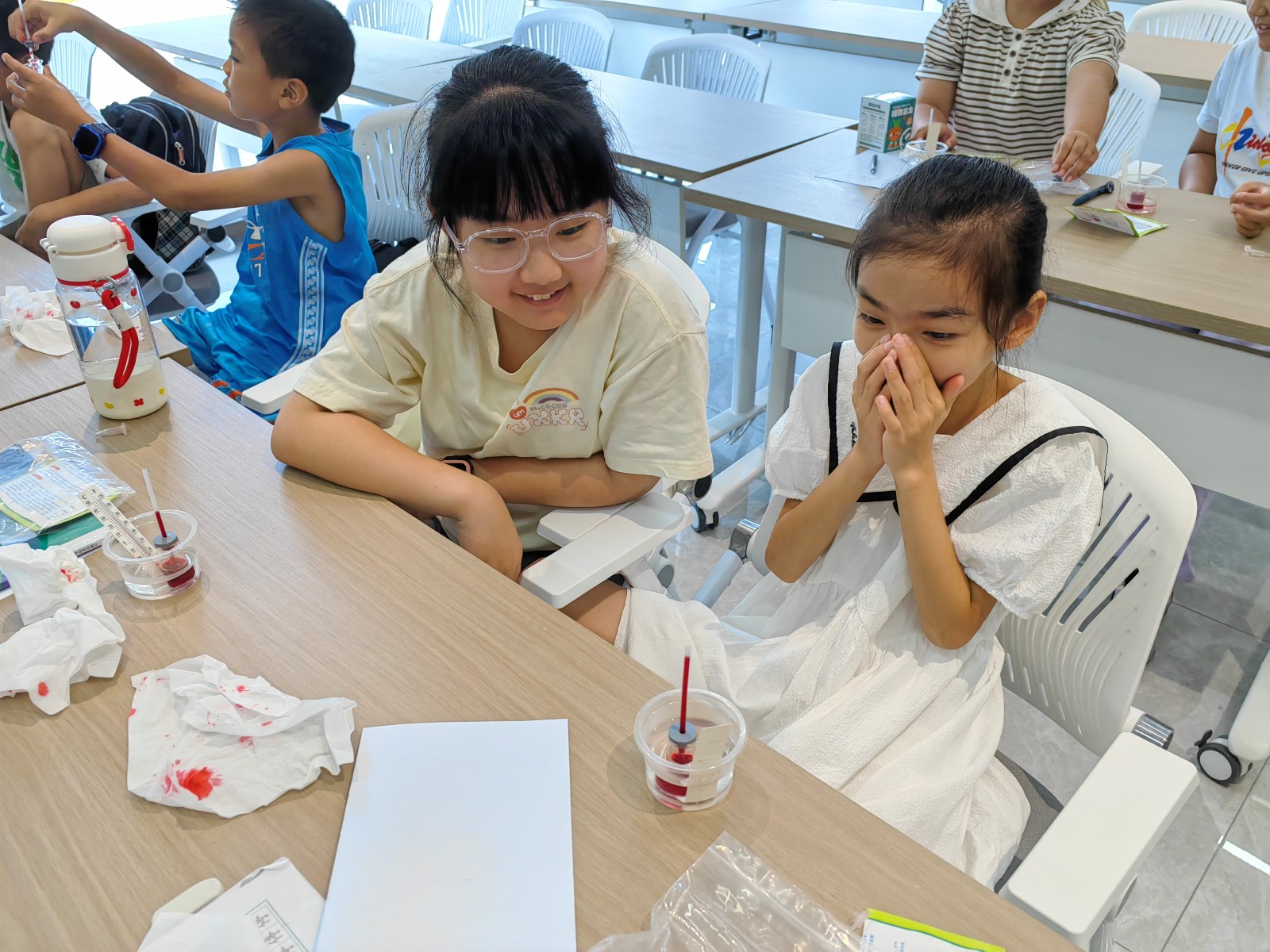 理论学习后,活动进入了动手实践环节。老师分发了小玻璃瓶、透明吸管、食用色素和清水等材料。孩子们在老师的指导下,一步步操作起来:先在清水中滴入色素便于观察,然后将混有色素的水小心倒入小瓶中;接着,将吸管垂直插入瓶中,确保吸管口没入水中;最后,用橡皮泥或黏土将瓶口密封严实。一个简易的温度计雏形就完成了。