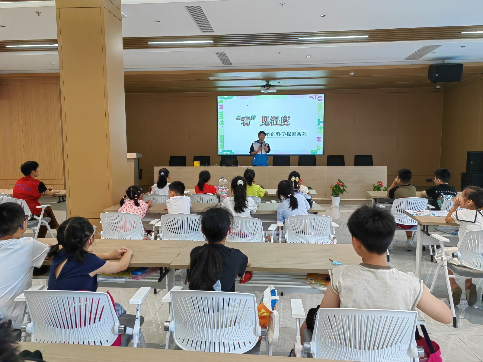 课堂上,北仑区志愿者协会的老师首先向孩子们展示了常见的温度计。孩子们认真观察温度计的结构,特别是那根会随着温度变化而升降的液柱。老师仔细讲解了温度计的工作原理,指导孩子们如何准确读取温度计上的刻度数字。孩子们专注地看着手中的温度计,学习辨识不同的温度数值,理解冷热变化如何被这根小小的玻璃管记录下来。