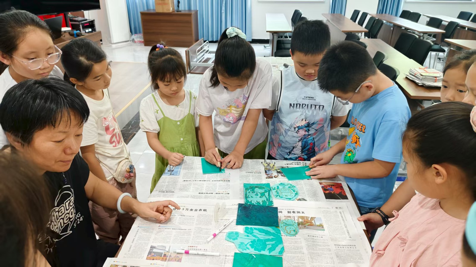 活动现场,在老师的指导下孩子们认真裁纸,仔细拓墨,一丝不苟地拓印。经过一番努力,一幅幅印有传统元素的彩色版画和纸扇逐渐成型,现场充满了孩子们的欢声笑语与成功的喜悦。