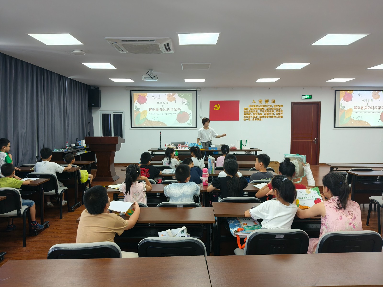 活动伊始,实践团成员以沉浸式剧情揭开序幕:“番茄特工”的“分子日记”引发阵阵惊叹。团队成员们将一周前社会实践时深入田间,从果农处得到的“滚烫”知识化为生动有趣的语言图片,以小学生喜闻乐见的标题为切入点,用起关键作用的物质分子式为连接线,深入浅出地讲解了番茄的成长过程、熊峰的授粉形式、西红柿中包含的营养等等,让知识不再抽象。