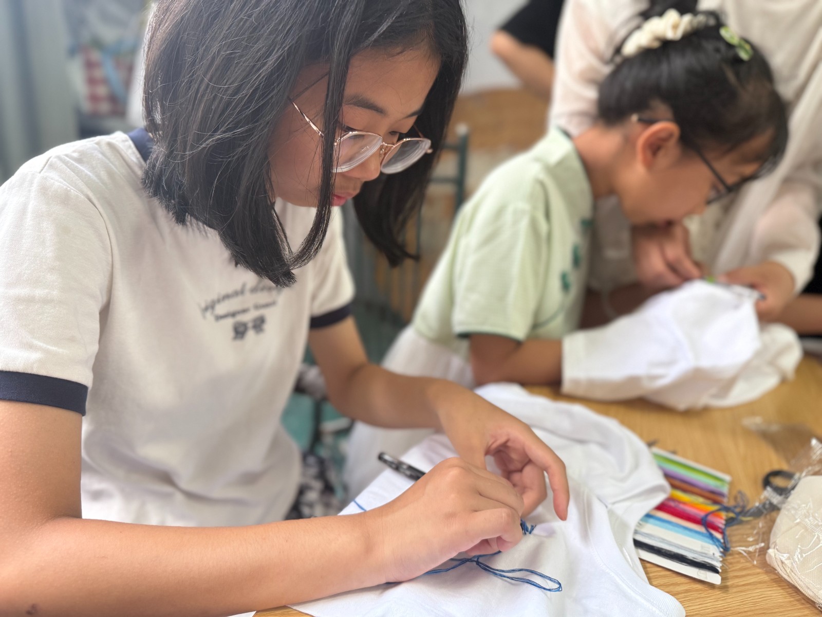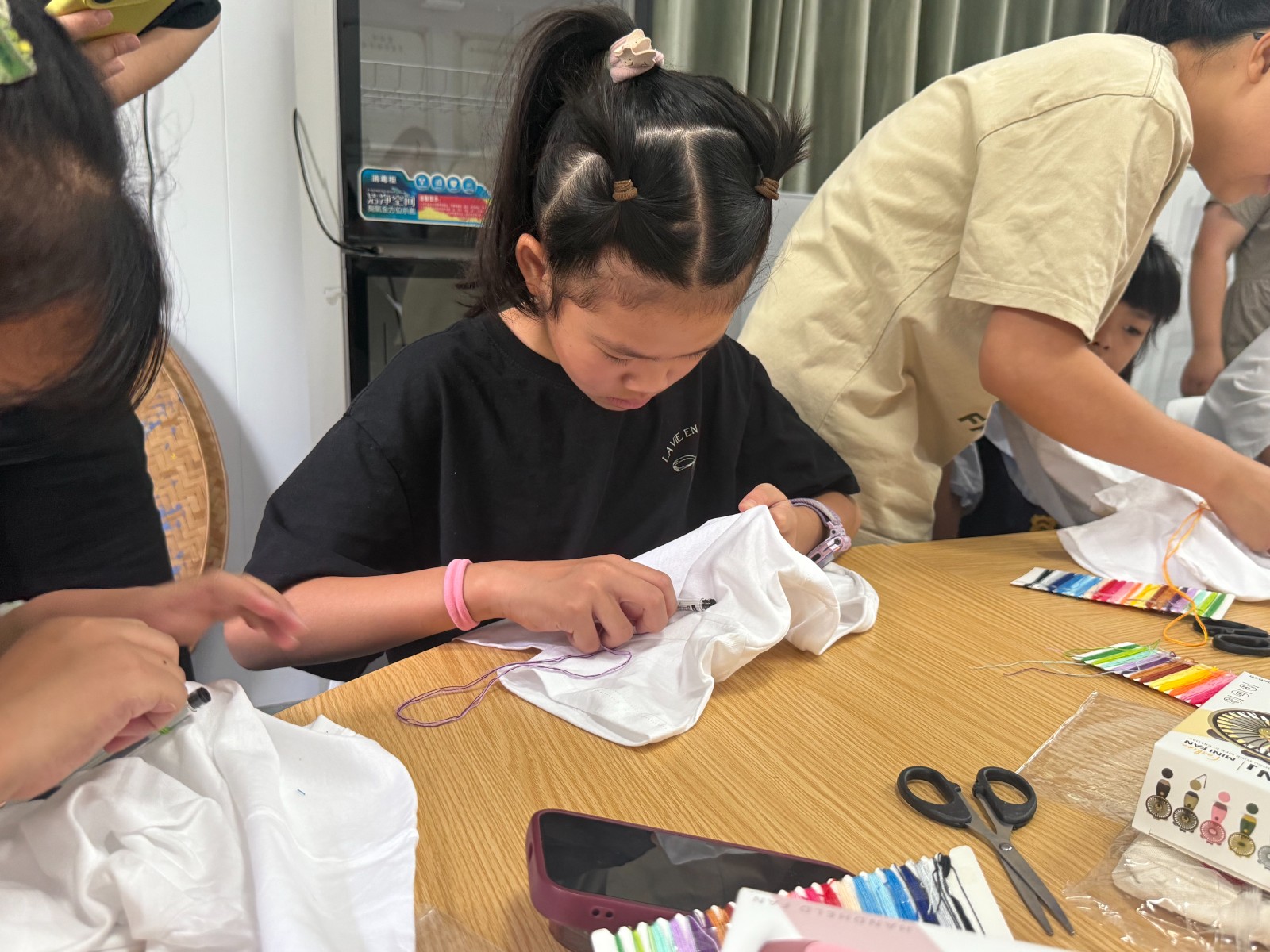 活动中,志愿者老师先示范穿针、打结等基础技巧,再分解蝴蝶翅膀的对称纹路和圆圈的均匀针法。孩子们拿着针线,从生疏到熟练,专注地在白色T恤上创作,在志愿者老师的悉心指导下,孩子们完成了以蝴蝶、圆圈为主题的刺绣作品,指尖翻飞间,原本朴素的T恤变得生动活泼。