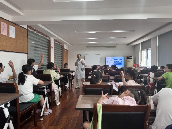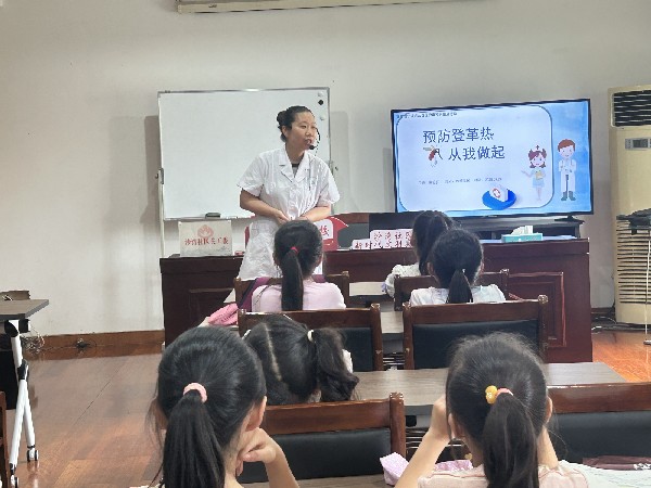 登革热是由登革病毒引发的急性虫媒传染病,近期湿热气候正适合其传播媒介——伊蚊大量繁殖。讲座中,俞医生深入浅出地讲解登革热相关知识细致解析传播链条,明确该病主要通过伊蚊叮咬传播,潜伏期为 7-14 天。同时着重强调典型症状,包括 “三痛”(头痛、肌肉关节痛、眼眶痛)、“三红”(面颈胸部潮红)、皮疹及出血倾向等,特别警示高热不退、剧烈头痛可能是重症信号,需立即就医。此外,俞医生分享的防蚊妙招实用又形象:安装纱窗如同给家筑墙,床上挂蚊帐似设堡垒,使用蚊香像布下隐形防护网,外出穿长裤能让蚊子无从下口。孩子们听得兴致盎然,频频举手互动,现场气氛热烈。