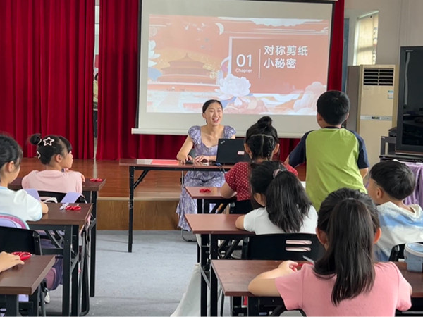 活动开始,陈华浦幼儿园老师向学生们介绍了剪纸艺术的历史渊源和文化意义,并讲解了剪纸的基本技巧,如对称剪裁、图案设计、纸张折叠等。同时,老师展示了多种剪纸作品,包括传统窗花、生肖图案和现代创意剪纸,让学生们对剪纸的多样性和艺术性有了更直观的认识。随后,老师从基础技法入手,耐心教授同学们如何折叠红纸、绘制图样,并示范了“对称剪”“镂空剪”等技巧。并强调:“剪纸不仅考验手上功夫,更讲究耐心和细心,每一刀都要稳、准、巧。”