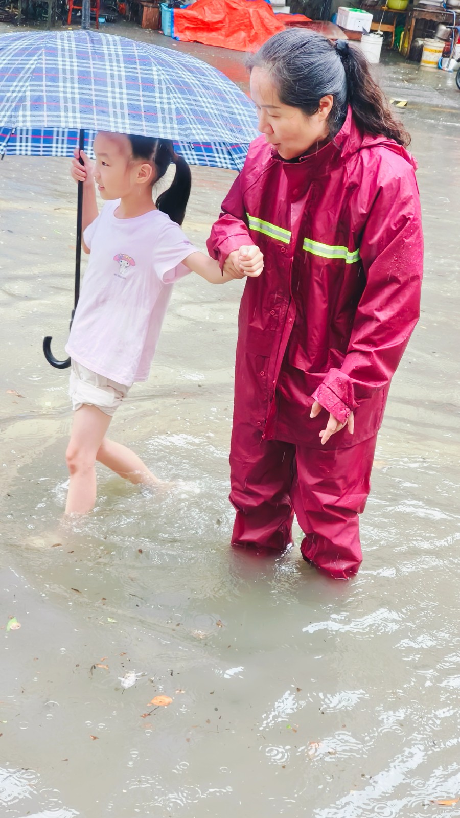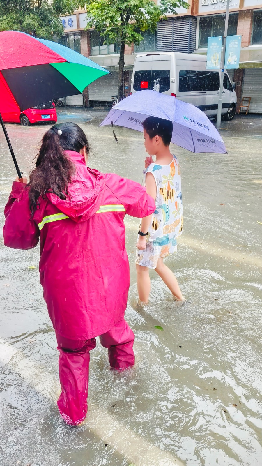 “别担心,阿姨背你们过去!”周静君没有丝毫犹豫,弯腰背起其中一个年幼的孩子,踏进浑浊的水中。积水浑浊,脚下深浅难测,她每一步都走得小心翼翼。其他社工们也迅速行动起来,或用背,或用抱,或手牵手牵引着年龄稍长的孩子,在风雨中搭起一道坚实的人链。一个孩子紧紧攥住社工的衣角,小声嗫嚅:“谢谢阿姨,水好凉。”社工抹了一把脸上的雨水,朗声回应:“不怕,我们走得稳!”风雨声、鼓励声交织,汇成生命守护的进行曲。