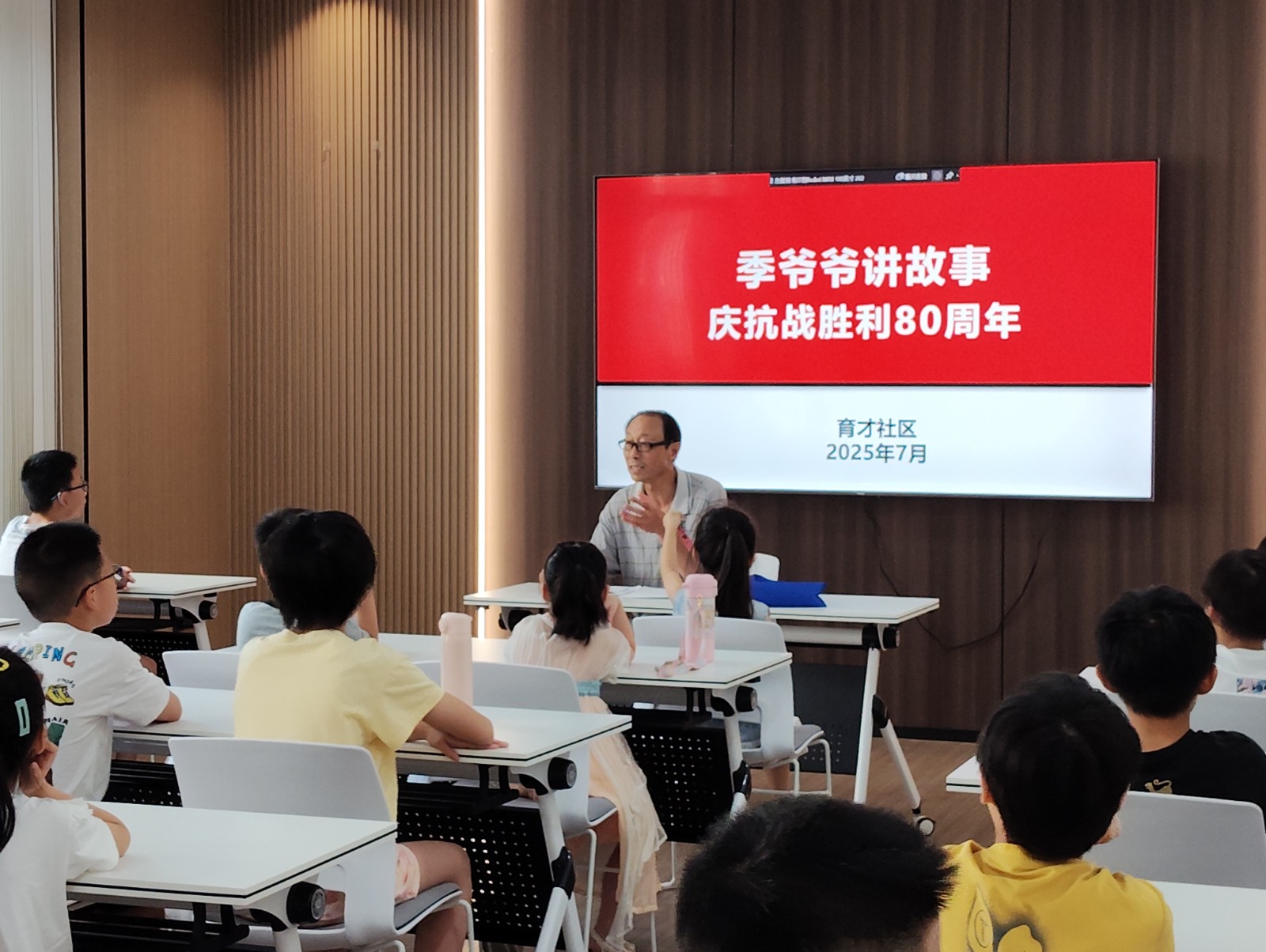 为纪念中国人民抗日战争暨世界反法西斯战争胜利八十周年,深切缅怀革命先烈,弘扬伟大抗战精神,激发社区居民的爱国热情,社区网格员邀请了区人大代表季闽浦来为社区青少年开展《烽火记忆——季爷爷讲抗战那些年的故事》专题讲座。