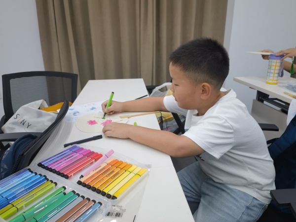 讲解过后,重头戏登场!孩子们迫不及待地拿起洁白的团扇和五彩画笔,在老师和志愿者的指导下,化身为小小“清廉设计师”。教室里瞬间安静下来,只听见画笔划过扇面的沙沙声,还有孩子们专注的小表情。“我要画竹子!竹子一节一节的,它很‘正直’,风再大也不弯腰!” 一个扎着小辫的女孩边画边认真地说。旁边的小男孩则屏住呼吸,小心翼翼地描着一个大大的“廉”字,虽然笔画还有些歪扭,但他写得格外认真。还有的孩子发挥奇思妙想:象征“出淤泥而不染”的荷花在扇面上亭亭玉立;大大的“清”、“廉”等字也成了独特的艺术装饰。每一笔一画,都饱含着孩子们对“清廉”最质朴的理解和美好的向往。