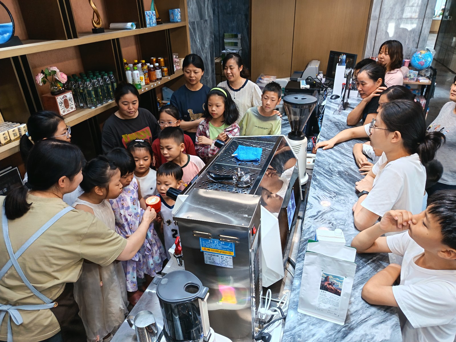 阅读分享意犹未尽,温馨场景移至书局吧台。在专业工作人员的细致引导下,家长与孩子携手体验咖啡制作的乐趣——亲手研磨咖啡豆的醇香四溢,合作打发奶泡的绵密柔滑,每一个步骤都成为亲子协作的温馨时刻。活动现场,新磨咖啡的馥郁与书卷特有的墨香和谐交织,营造出独特而迷人的氛围,笑容洋溢在每一组家庭的脸上。