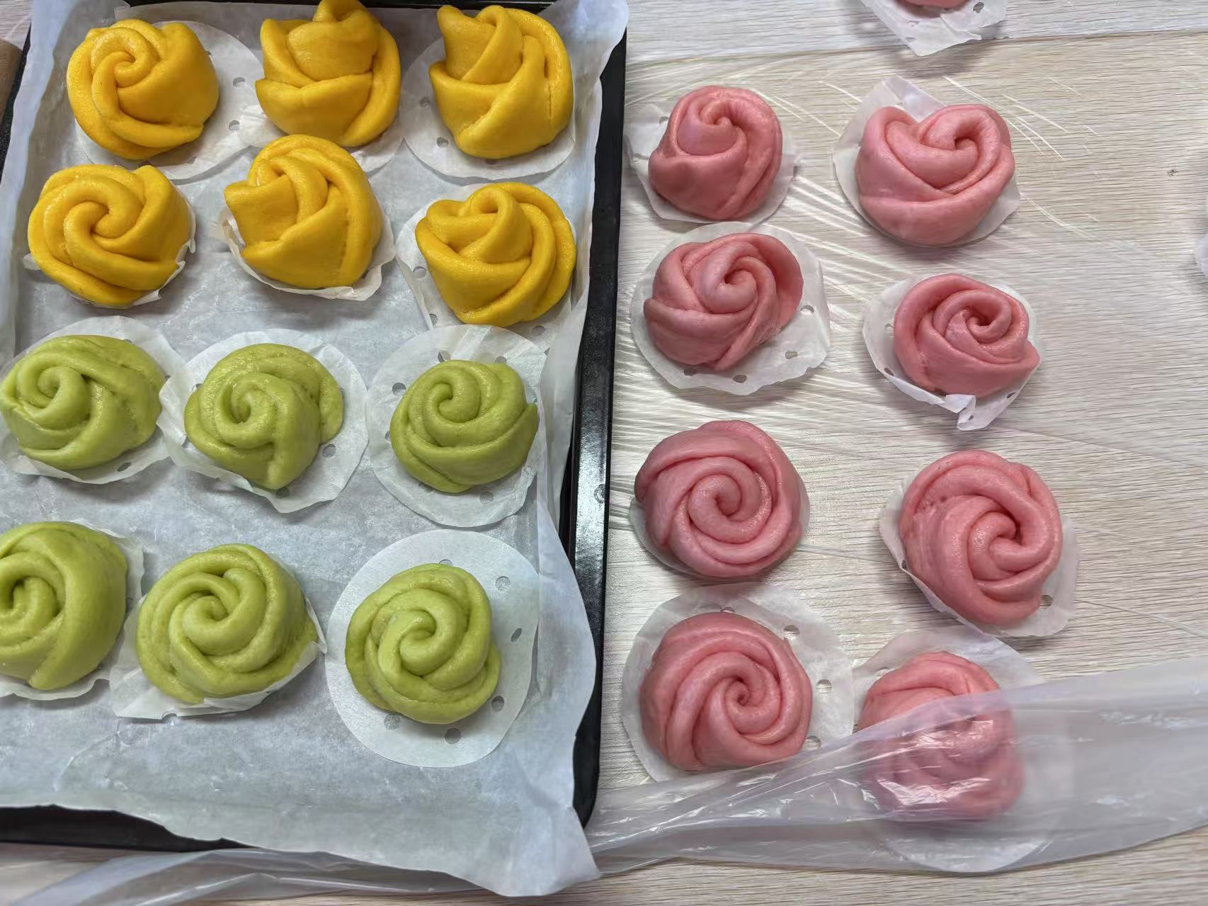 活动选用天然食材:菠菜粉调制的翠绿面团作枝叶,甜菜根染色的粉红面团为花瓣。面点师现场演示"五瓣玫瑰"技法——擀薄面皮、层叠卷曲、捏合花托,孩子们专注模仿,将普通面团变成栩栩如生的玫瑰。李欣乐小朋友兴奋地说:"原来馒头可以像艺术品一样精美!"