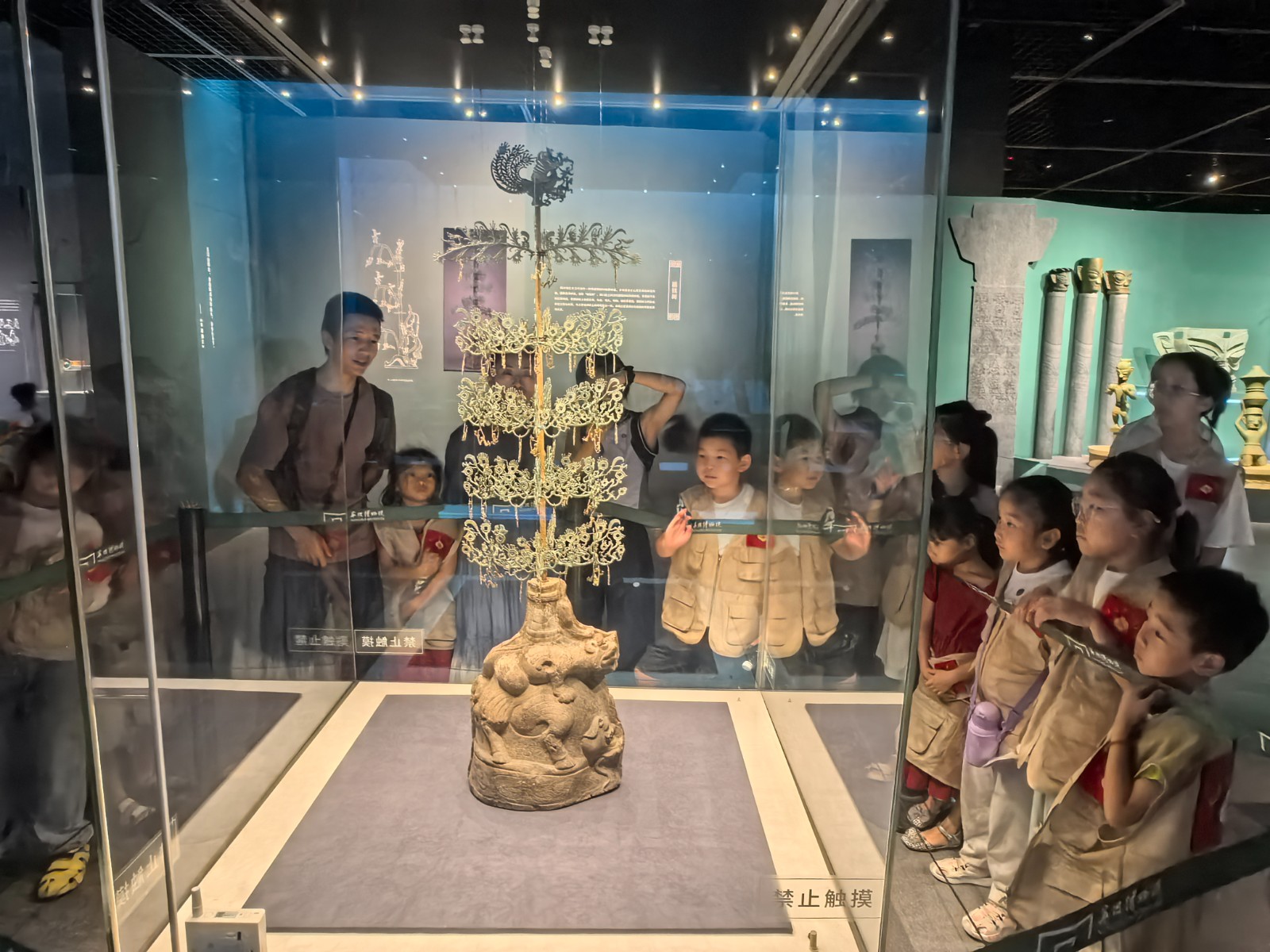 随后,大家一同参观了《吉星万里》三星特展。来自古蜀国的精美文物让青少年们大开眼界,青铜器、玉器、金器等展品造型奇特,工艺精湛,展现了古蜀国神秘而灿烂的文化。通过与宁波本地文化的对比,青少年们更加深刻地理解了中华文明的多元性和丰富性。一位参加活动的青少年表示:“这次研学活动让我学到了很多书本上学不到的知识,看到了不同地区的历史文化,感觉非常有趣。”