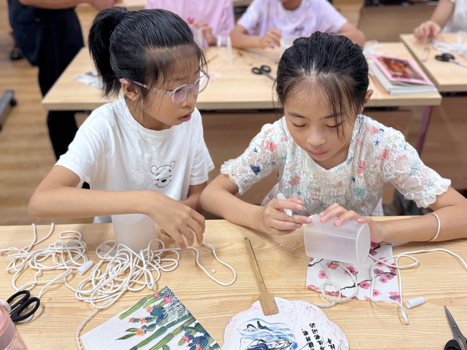 创意手工课上,非遗传承人孙人建老师巧妙地将环保理念与传统文化相融合。在孙老师的带领下,孩子们利用废旧纸筒、布料、彩绳等材料制作环保笔筒。大家发挥创意,为笔筒贴上可爱的贴纸,编织上精致的花纹,原本普通的材料摇身一变,在孩子们的手中变成了艺术品。