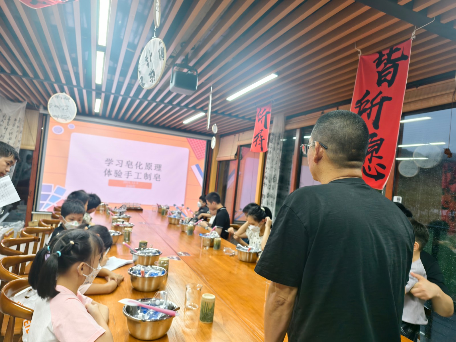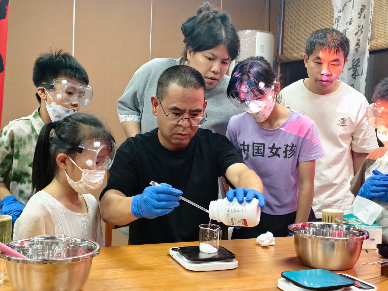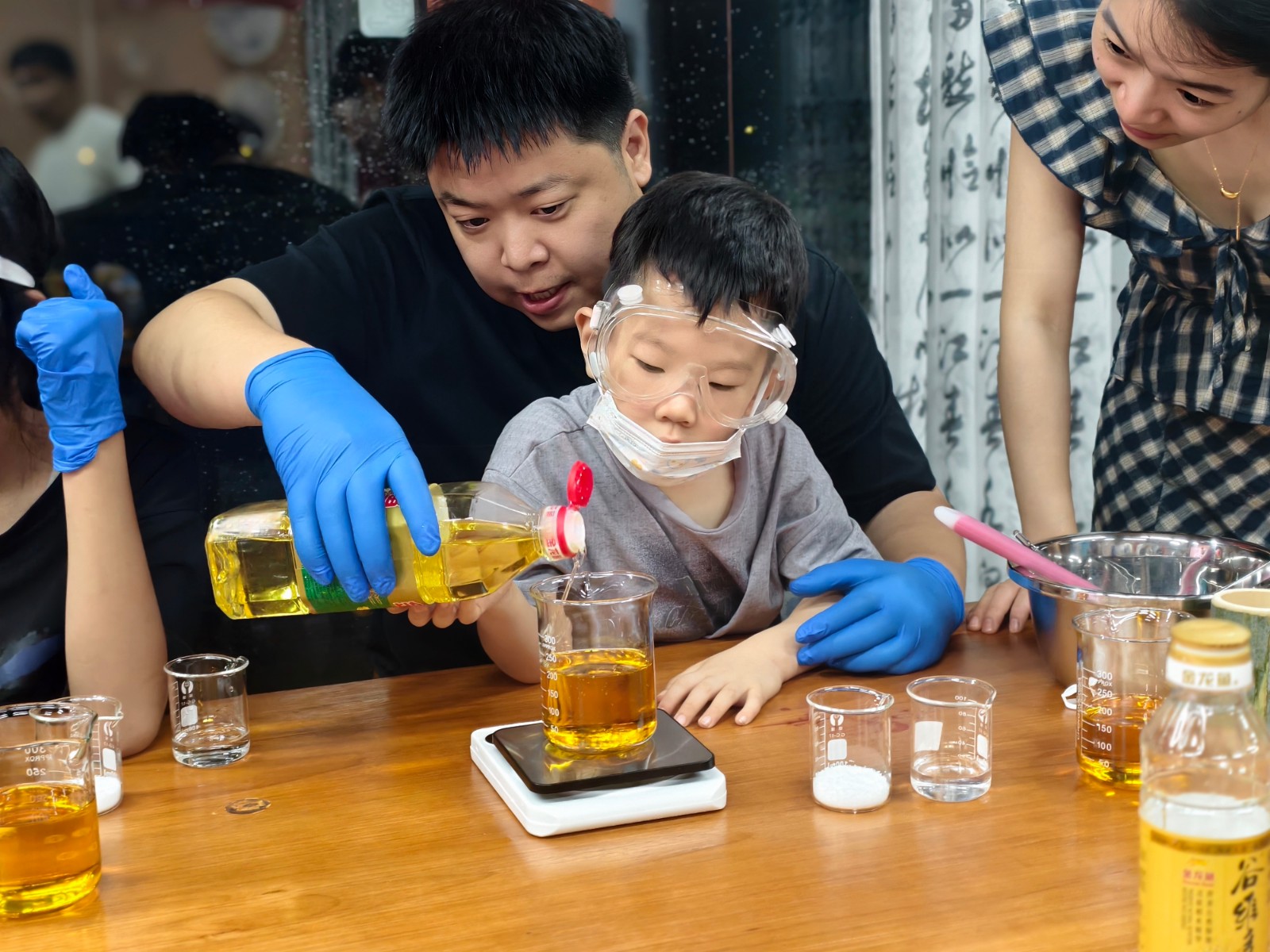 “为什么油乎乎的脏东西能被肥皂洗掉?”课程从孩子们日常生活中的疑问切入。在翁老师的引导和严密防护下,孩子们亲历了油脂的“蜕变”时刻:将食用油、牛奶与氢氧化钠溶液小心混合、搅拌。随着反应的进行,原本油水分离的混合物竟逐渐融合、增稠。老师深入浅出地揭示了其中的“皂化反应”密码——油脂在碱性环境下分解,华丽变身为具有清洁能力的肥皂和甘油。“原来妈妈用的肥皂是这样‘变’出来的!”一位小朋友兴奋地喊道,亲手触摸自己参与制作的肥皂雏形,成就感满满。