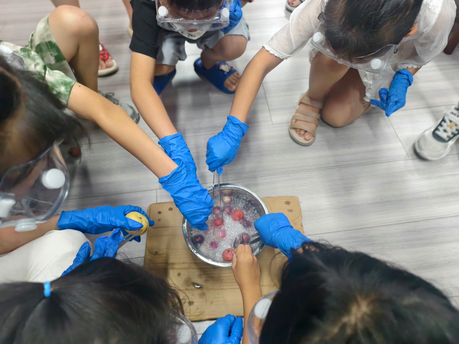 紧接着开始第二个实验。翁老师将干冰放入无水乙醇中,霎时烟雾弥漫。孩子们屏住呼吸,将圣女果、荔枝、葡萄等水果轻轻投入盆中。仅仅几秒钟,果肉硬如石子。孩子们取出后敲击桌面,满屋子都是清脆的“叮当”声!