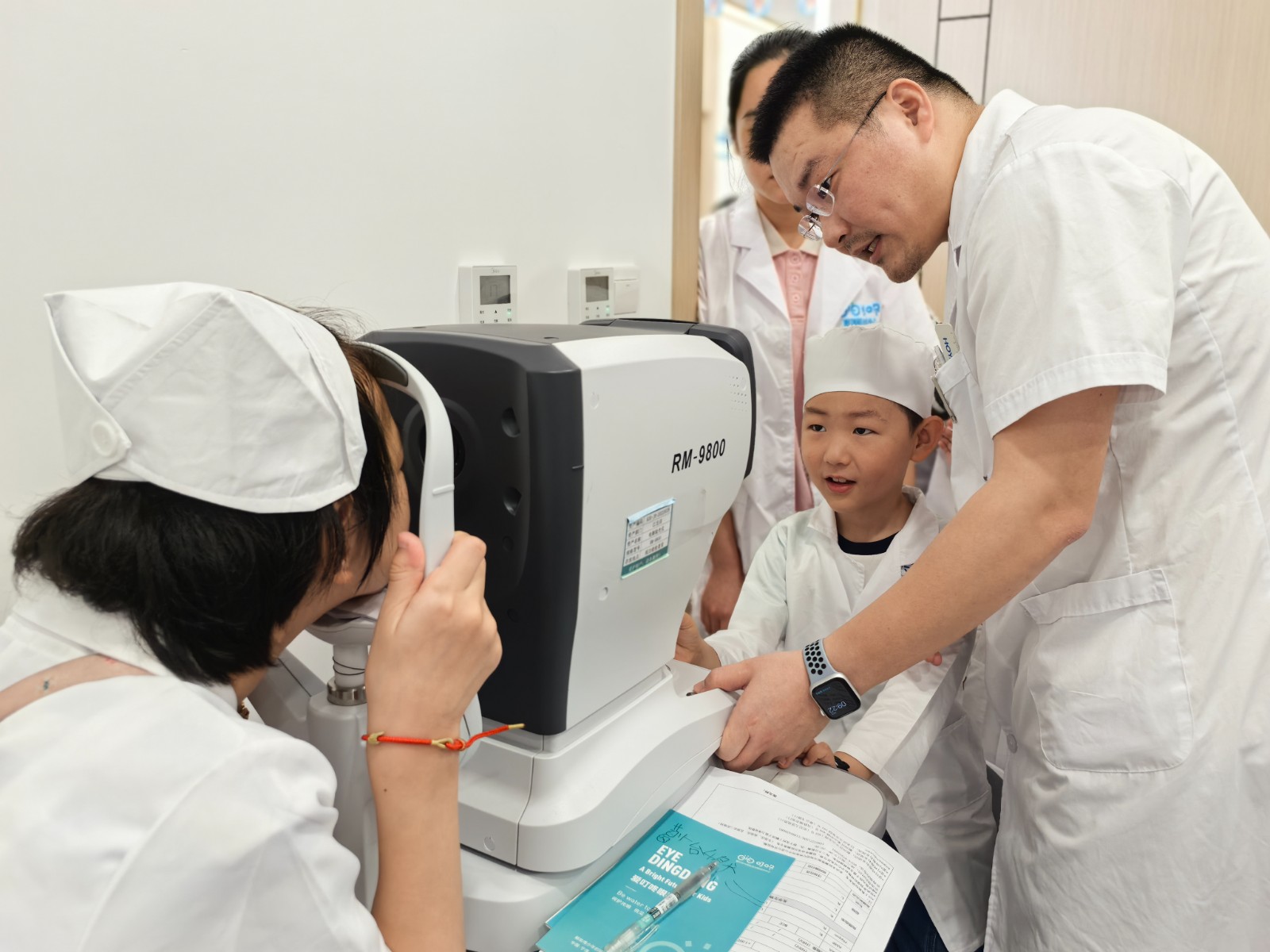 活动伊始,小朋友们换上专属的迷你白大褂,正式“上岗”。在爱叮咚眼科专业医生和工作人员的带领下,他们深入眼科检查的各个场景。在验光室,孩子们好奇地操作电脑验光仪,亲眼见证视力检查的“科技感”,发出阵阵惊叹;在视力检查区,“小医生”们认真地为同伴指认视力表,体验医生的责任;最令人印象深刻的是裂隙灯检查环节,孩子们在医生指导下,小心翼翼地互相观察,第一次在显微镜下清晰地看到睫毛和眼球的细微结构,探索欲瞬间被点燃。