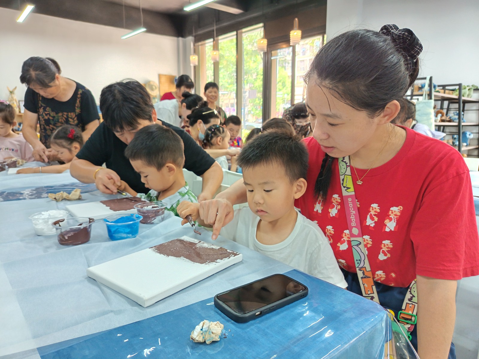 在随后的 湖泊肌理画 创作环节,网格志愿者为每组家庭分发了画、颜料和砂石等材料。在老师们的指导下,家长与孩子分工协作,用刮刀将蓝绿颜料进行充分的搅拌,随后在画板上逐步晕染出湖水的层次感,最后用细沙模拟湖岸肌理。你看这抹浅蓝像不像清晨的湖面 家长先生边指导孩子调色边说,这种动手体验比单纯说教更能让孩子学会地理知识,记住环保的重要性。