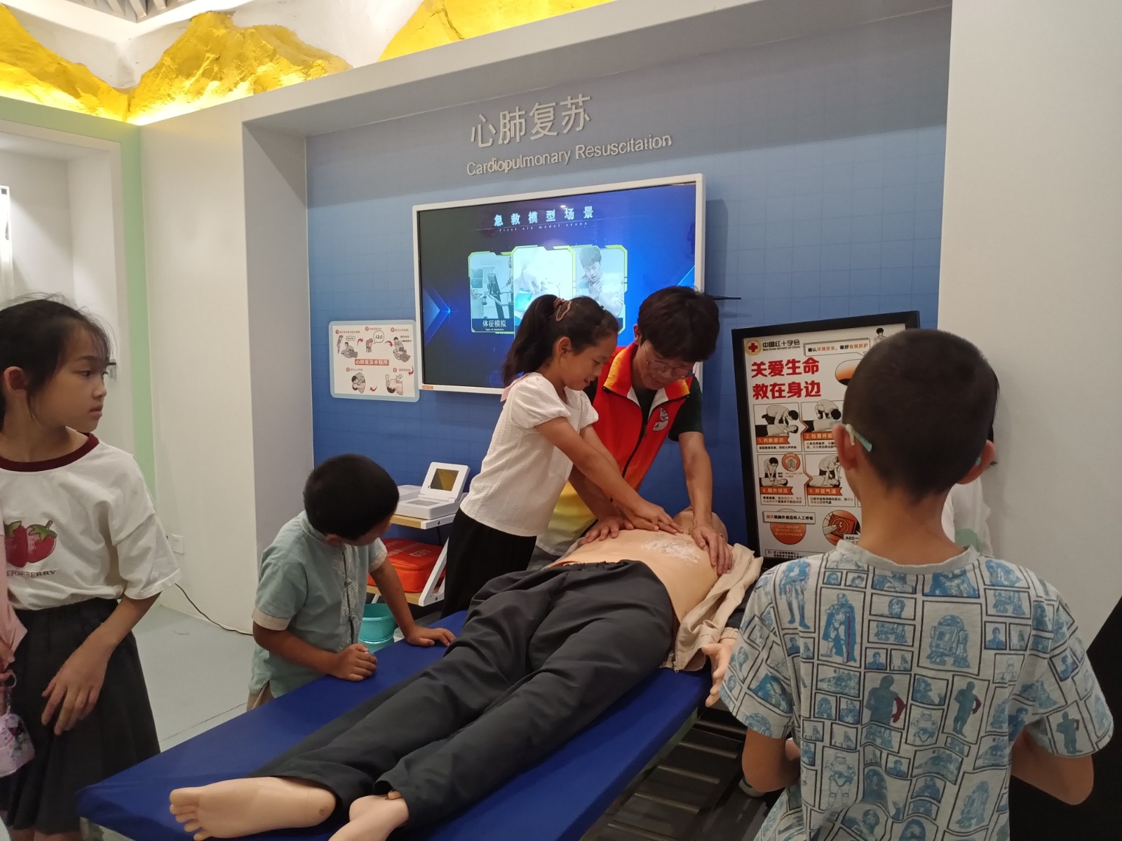 在互动体验区,专业医护人员现场示范了心肺复苏和海姆立克急救法。孩子们轮流在仿真假人模型上练习胸外按压与人工呼吸,用小玩偶模拟气道异物梗阻急救场景。“按压要用力,频率要保持每分钟 100 到 120 次。” 医护人员耐心纠正动作细节,让孩子们在实践中掌握基本急救技能,更体会到生命健康需要科学守护。