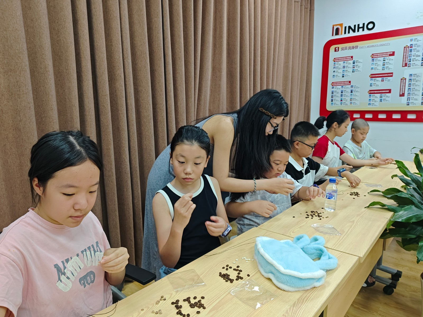 进入动手实践环节,孩子们迫不及待地打开材料包,里面装有色彩各异、大小不一的咖啡豆、弹性线、细针以及装饰配件。大家充分发挥自己的想象力,认真构思设计,小心翼翼地将一颗颗散发着自然清香的咖啡豆串联起来。过程中,孩子们互帮互助,交流配色与造型心得,不时互相展示自己的半成品。青少年宫的老师们则穿梭其间,耐心指导,鼓励孩子们大胆创作。不一会儿,一串串独具匠心、充满童趣的咖啡豆手链便在孩子们灵巧的双手中诞生了,普通的咖啡豆摇身一变,成为了承载满满心意的手工艺术品。