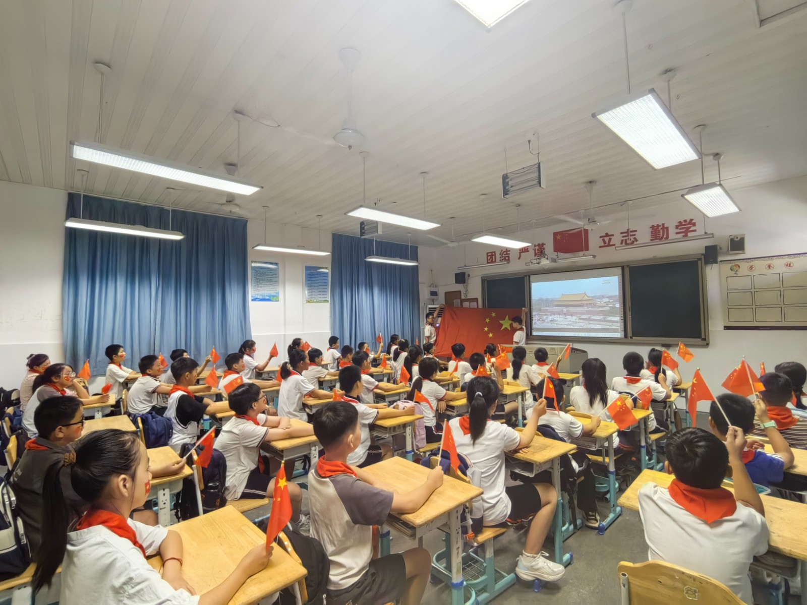 上午九点整,随着班级大屏幕中雄壮的《义勇军进行曲》奏响,鲜艳的五星红旗冉冉升起,全场肃立,向国旗行注目礼。教室里的孩子不约而同地挺直腰板站了起来,高唱国歌。当镜头切换至长安街,气势恢宏的阅兵式正式拉开序幕。