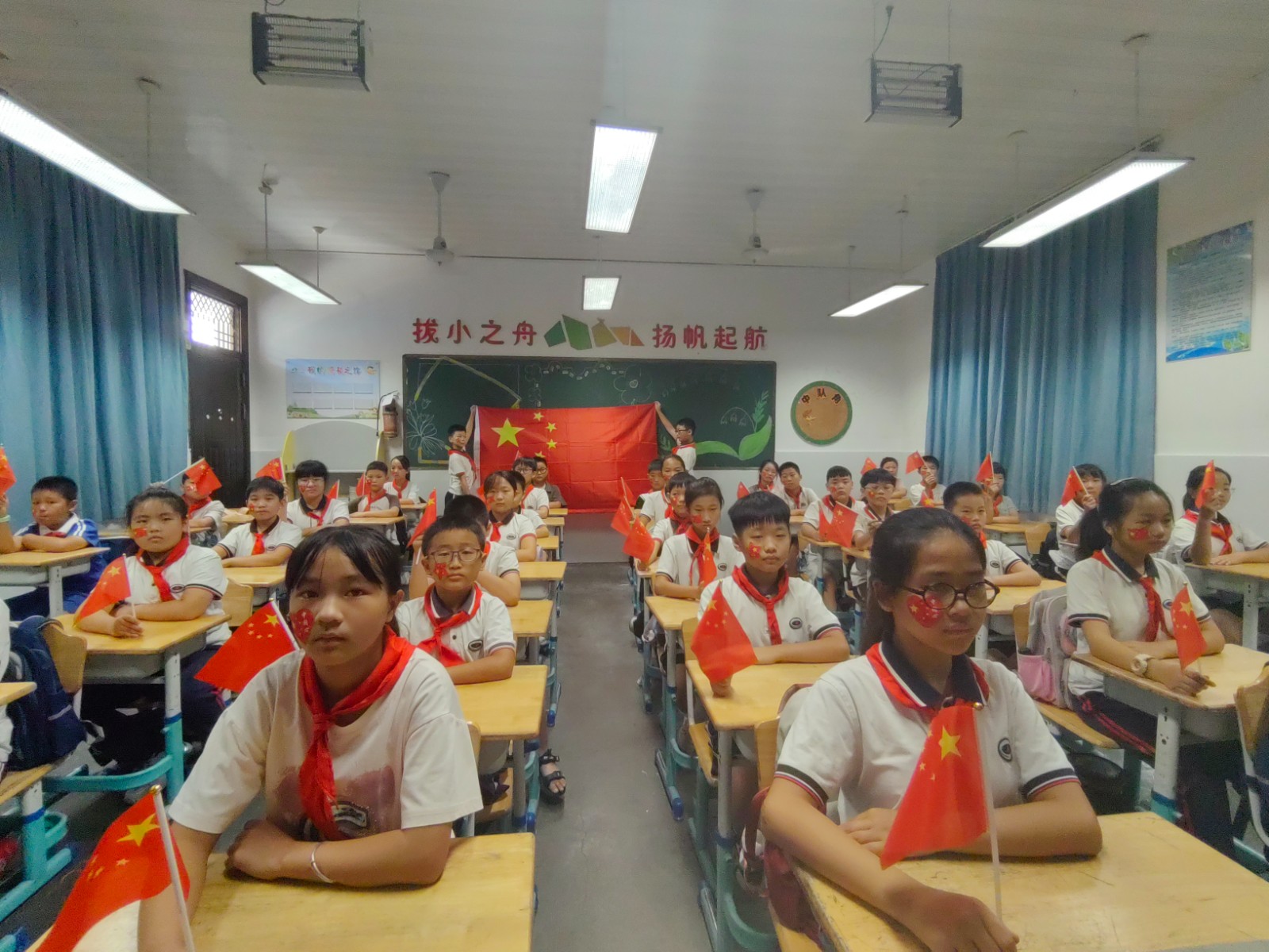 “看!那是仪仗方队!”不知是谁轻声惊呼所有同学的目光瞬间聚焦在投影屏幕上——身着礼服的三军仪仗兵迈着铿锵有力的步伐走来,他们完全一致地挥动着手臂,真是让人感到震撼。孩子们不由自主地挥起小红旗每一位同学的脸上都写满了自豪。