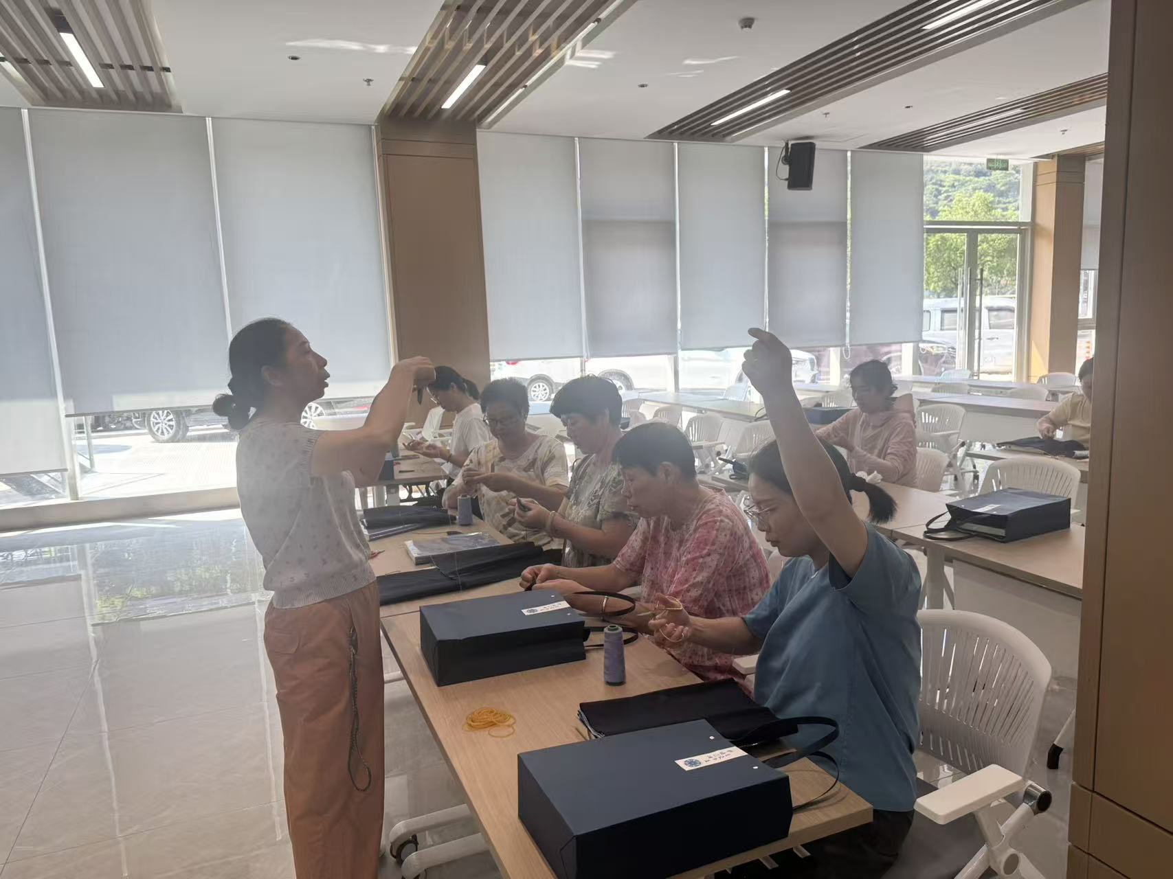 活动伊始,社区工作人员向奋战在教育一线的在职教师和长期关心支持社区青少年工作的“五老”志愿者们表达了最诚挚的节日祝福和衷心的感谢。接着,在王丽老师的耐心讲解和示范下,平日里手握粉笔的老师们和阅历丰富的“五老”志愿者们化身为“工匠学徒”,充满了好奇与热情。大家认真学习扎染的基本技法,如折叠、捆扎、缠绕、夹结等,运用皮筋等工具,将纯白色的棉布笔记本封面进行创意造型与固定。