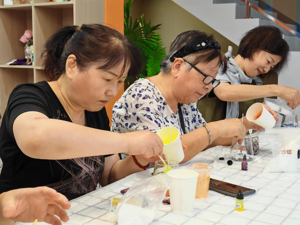 活动伊始,社区网格员细致演示了彩沙分层、烛芯固定及精油添加等制作技巧。居民们在指导下充分发挥创意,将五彩细沙分层铺入玻璃器皿,注入晶莹蜡液,精心点缀干花、贝壳等元素,创作出各具特色的沙画蜡烛作品。现场氛围温馨融洽,孩子们专注装点沙层,家长们热情交流制作心得,跃动的烛光映照着一张张洋溢着笑容的脸庞。