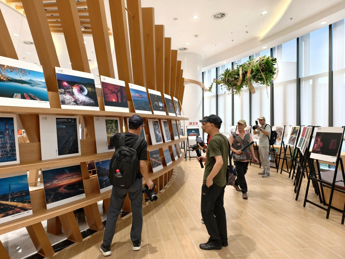 展览区沿场馆弧形墙面错落排布,既有大幅面冲击力十足的风光组照——雪山巅的晨曦将云海染成蜜色,梯田层叠如大地指纹;也有方寸间定格人间烟火的纪实作品:菜场里摊主抬头时眼角的皱纹,放学路上孩童牵着气球奔跑的背影。角落里一组微观摄影尤为吸睛,露珠里倒映的虹,昆虫翅膀上的鳞片纹路,将日常忽略的细节放大成令人屏息的宇宙。参观者们或驻足凝视,或举着手机调整角度拍摄,穿深色马甲的工作人员轻步穿梭,为需要更近距离观察的观众调整展签灯光。