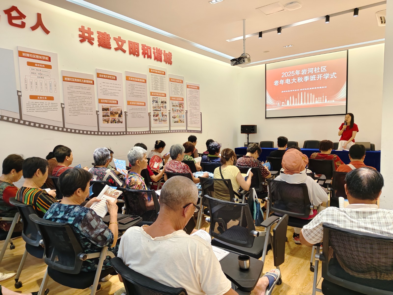 近日,岩河社区2025年秋季班老年电大开学典礼在岩河社区党群服务中心温暖开幕,30余名老年电大的学员欢聚一堂,共同迎接新一学期的学习之旅。