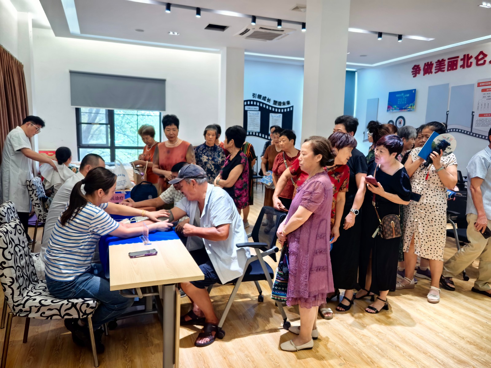 随后,社区邀请大碶杏济堂中医馆专业医师团队,为学员们带来了一场健康义诊服务,内容包括量血压、中医脉诊和肩颈理疗等项目。医生们耐心询问每位老人的身体状况,提供个性化中医调理建议,尤其针对老年常见病预防和日常保健做了细致讲解,让大家在学习之余,也更关注自身健康。