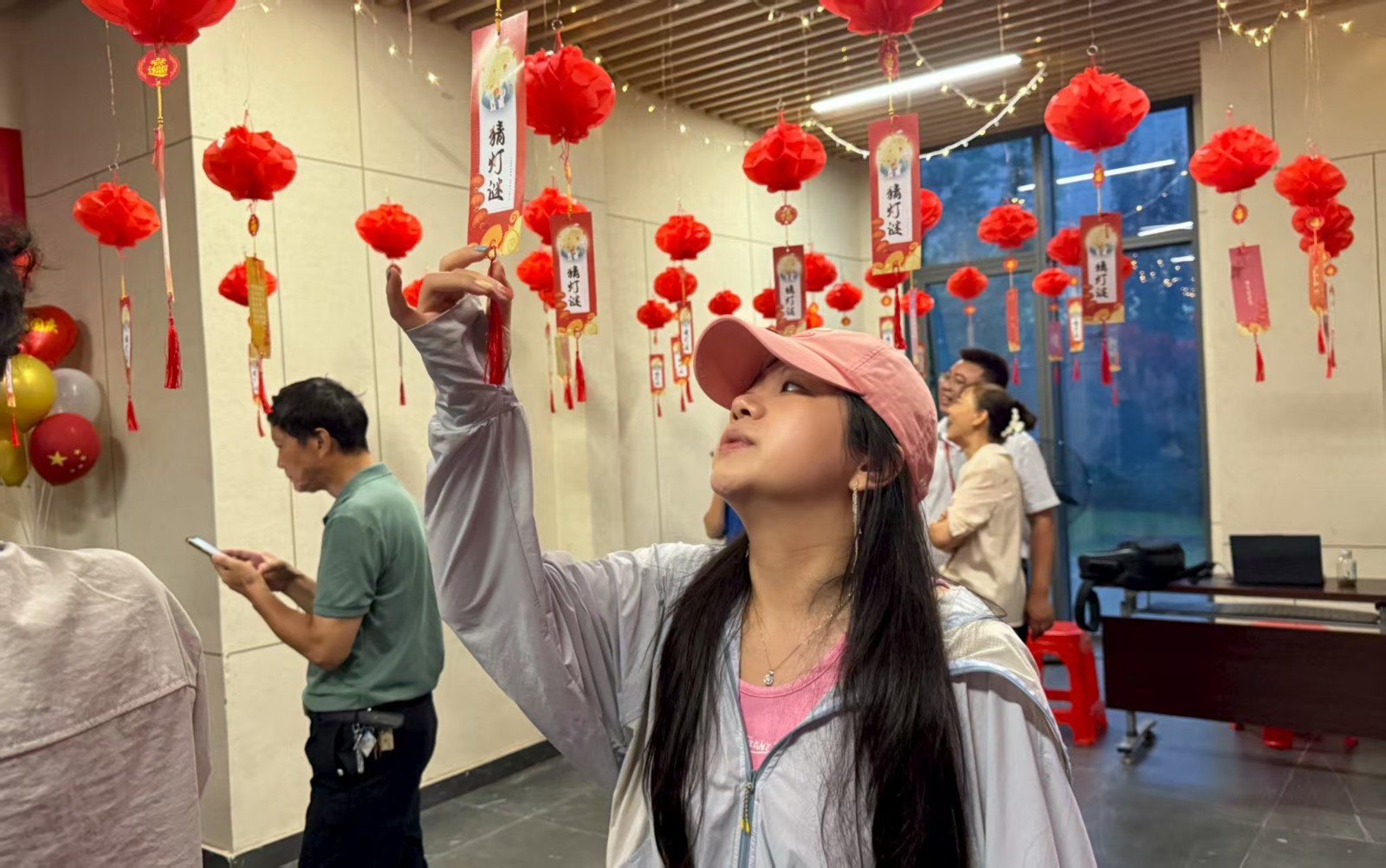 活动现场布置得格外喜庆,鲜艳的五星红旗与象征团圆的灯笼相互映衬,挂满了精心准备的灯谜纸条,涵盖传统文化、节日习俗、科普知识等多个类别,既有趣味性又具知识性。