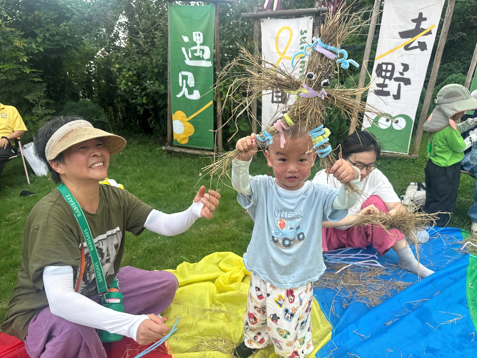 随后的田园寻宝环节将活动推向了第一个小高潮。每个家庭拿到一张充满挑战的寻宝清单——一片黄色的叶子一根短短的稻草……孩子们在家长的陪伴下,兴致勃勃地在田埂间、草丛中仔细探寻。最令人惊喜的是认识并体验打栗子的过程,看着带刺的栗子苞从树上落下,孩子们发出了阵阵惊叹,亲身感受到了秋收的真实与喜悦。活动的压轴环节是创意稻草人制作。各家庭利用农趣园提供的稻草、旧衣服、帽子和颜料等材料,充分发挥想象力,共同设计和制作独一无二的迷你创意稻草人。