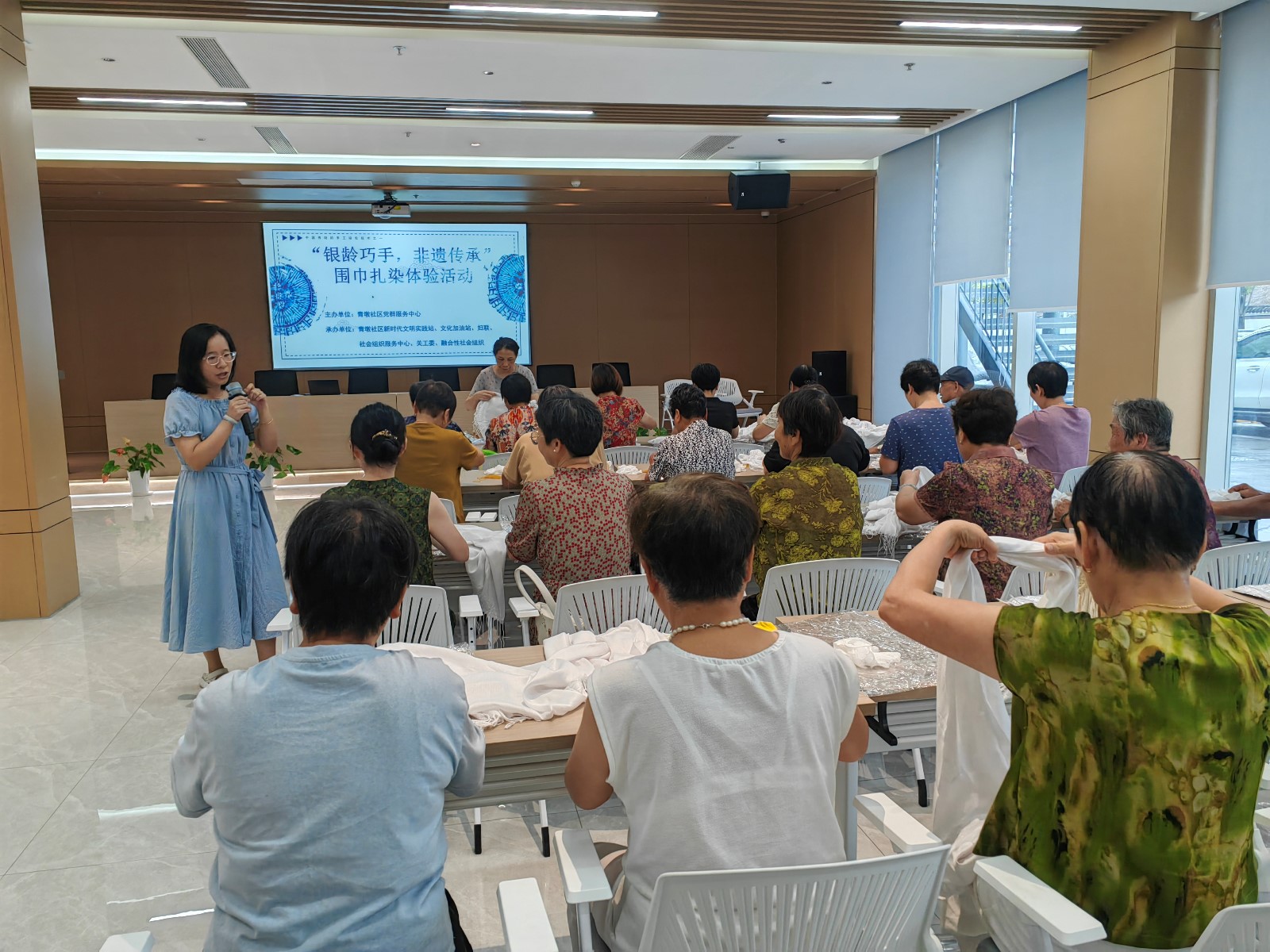 当洁白的围巾与天然染料相遇,当创意与古老技艺碰撞,会创造出怎样的独特艺术?923日下午,青墩社区党群服务中心内欢声笑语,社区联合小港街道社会事务办公室开展银铃巧手,非遗传承为主题的非遗扎染围巾制作活动,社区企退人员亲手体验了这项充满惊喜的千年技艺,感受了非遗文化的独特魅力。
