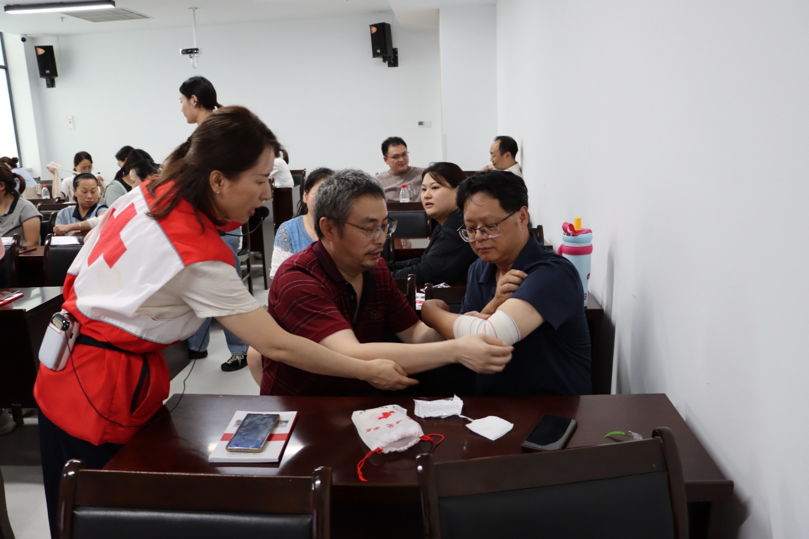 本次培训特邀区红十字会资深讲师授课,采用“理论讲解+实操演练”方式,围绕心肺复苏、气道异物梗阻处理、AED使用、创伤止血与包扎等实用技能展开。授课老师用通俗易懂的语言,结合真实案例,深入浅出地讲解急救“黄金四分钟”的重要性,并现场示范心肺复苏标准操作流程。