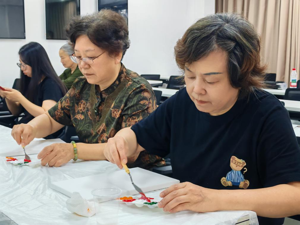 进入创作阶段,专业老师提供了“记忆中的风景”、“内心的情绪地图”等数个充满人文关怀与自我探索意味的主题。这促使居民们的创作不再是简单的模仿再现,而转向一种自我叙事的内观表达。在选择主题、领取画板、塑形膏、矿物颜料及其他综合材料的过程中,每一位居民都成为了决策的主体。创作途中,艺术老师与社区网格员穿行其间,他们的角色远不止于技术指导者,更是积极的倾听者和共情的鼓励者。他们协助居民将抽象的情感转化为具象的图案,将不确定的尝试转化为自信的笔触,整个空间弥漫着专注而支持的能量场,这是一个共同体在协同创造美的现场。