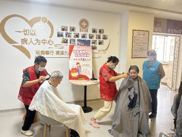 活动现场,志愿者们手持剪刀、梳子,带着节日的祝福来到老人身边,一边与老人亲切交谈,了解老人的理发需求,一边熟练地挥动着剪刀和梳子,为老人精心修剪发型。对于行动不便行动受限的老人,志愿者们主动提供“床边义剪”服务——他们轻手轻脚地调整病床角度,小心翼翼地为老人围上围布,全程动作缓慢柔和,生怕让老人有丝毫不适,细致的照料让老人们在秋日里感受到了如家人般的温暖。志愿者还将现场变“技能小课堂”,借双节契机向护工传艺。“过节就得让老人清清爽爽!理发关键在‘轻’和‘慢’,绝不能扯头发。”志愿者边梳老人白发边示范,“发质硬、白发多就先梳顺,剪刀斜 45 度从发梢往上剪,既自然又不疼。”护工们认真聆听,不时用手机拍摄记录,并就细节问题与志愿者深入交流。