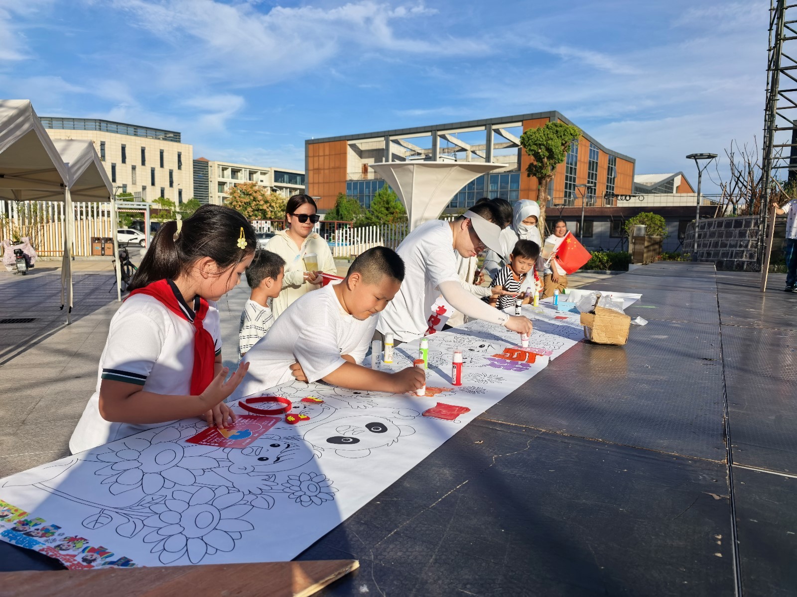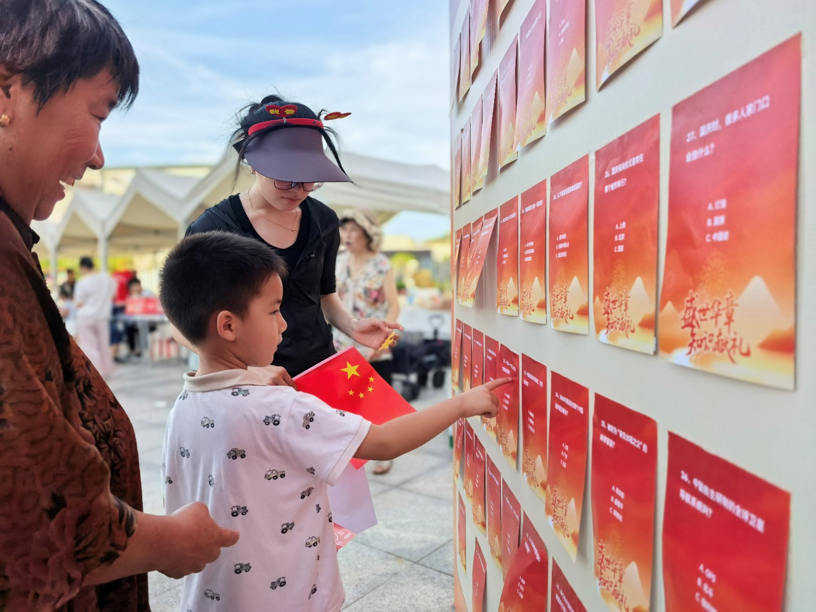 “国庆集爱”互动环节,志愿者手把手教孩子们折“告白花”,绘画区里,孩子们趴在长桌上创作,有的画天安门与飘扬的国旗,有的画和平鸽与气球,家长们在一旁拍照,还互相夸赞。“玉兔抱月套圈”游戏前,欢呼声此起彼伏。孩子们踮着脚,瞄准目标投掷套圈,没套中的小朋友皱着眉头,套中的孩子,兴奋地欢呼出声。“盛世华章 知识献礼”环节,居民们踊跃参与,小朋友们更是不甘示弱,“我们祖国的生日是10月1日”“我国的首都在北京”“我国的国旗是五星红旗”……稚嫩的回答声接连响起,即便遇到答不上的题目,孩子们也会认真听志愿者科普。