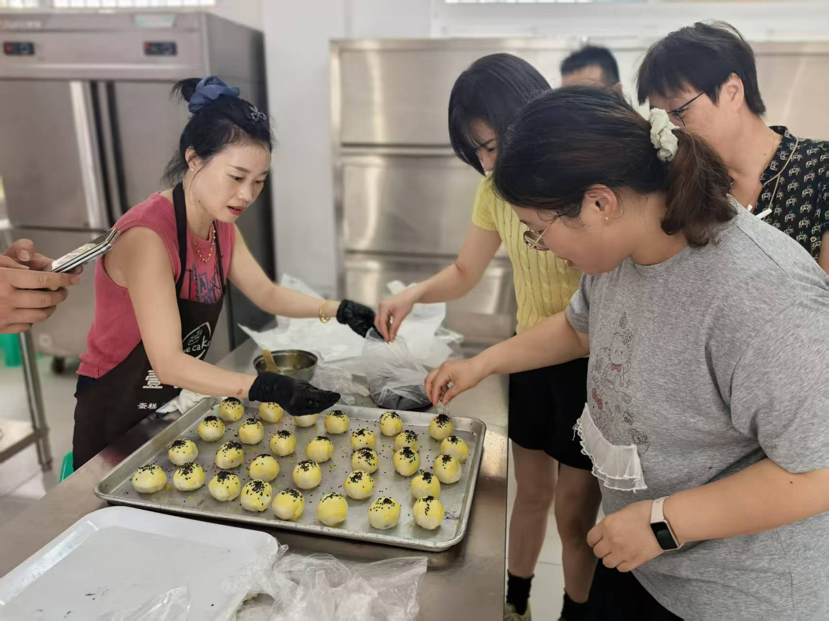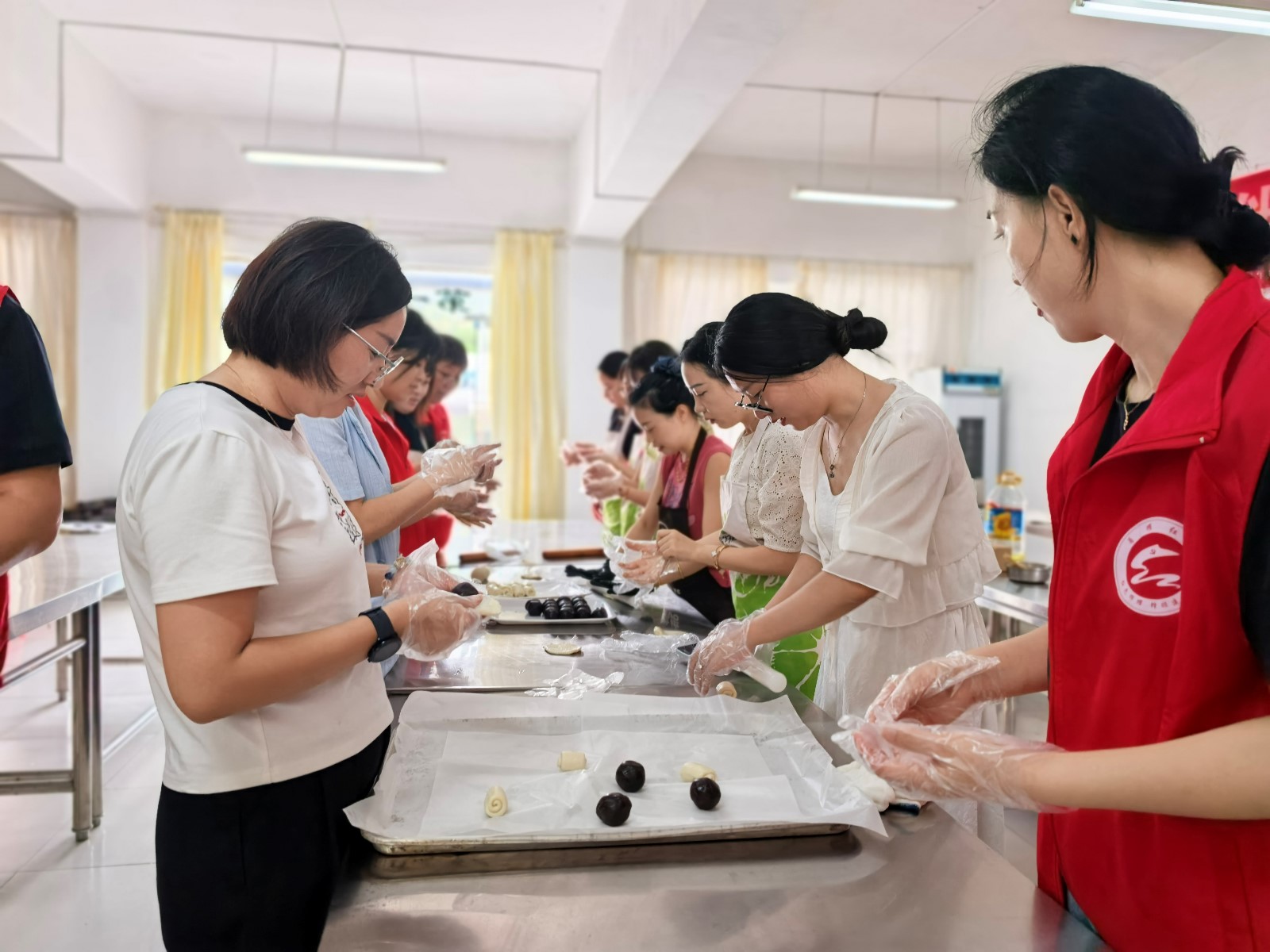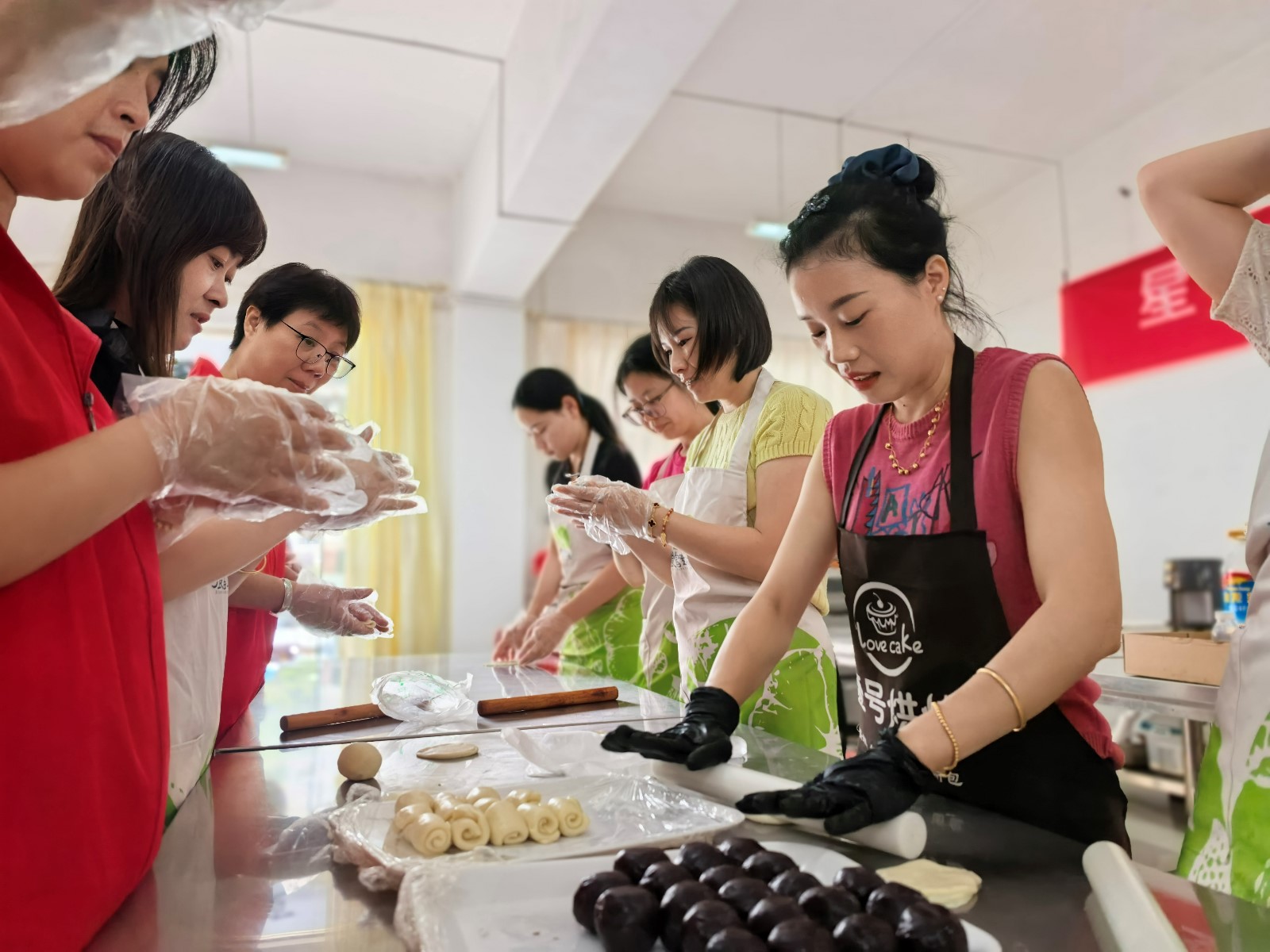 中秋佳节前夕,梅山街道党群服务中心联合梅山成校组织开展“月饼传情颂党恩”为主题的中秋送暖活动。9月30日,街道“飨嫂工坊”的十余位飨嫂们巧手作饼,将心意揉进面团、包入馅料,为辖区老党员送去满载关怀的节日祝福。  活动现场,飨嫂们围在桌前,在烘焙老师的指导下分工协作,“揉面团时掌心施力均匀,确保饼皮软糯筋道,压模具时精准对齐,花纹才清晰......”飨嫂们认真地听老师讲解,王大姐还一边称量馅料一边念叨:“山楂馅不错,有助于消化,也不太甜,适合老年人!”。