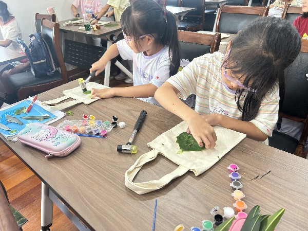这门千年手艺适配秋天,叶片色彩丰富、叶脉饱满,不用化学染料,就能把银杏黄、枫叶红拓在布袋上,做成天然秋日纪 活动伊始,社区教育志愿者结合秋日景致介绍植物拓印技艺。随后,志愿者带孩子们户外拾叶,叮嘱道:枫叶带锯齿、银杏像小扇,选这类叶片拓印才好看,且只捡落叶、不摘嫩叶。孩子们化身 秋日小收藏家,很快捡满各式各样的叶片,每片叶子都藏着秋天的印记。拓印环节,孩子们化身自然艺术家”,在志愿者的指导下,选叶片、摆位置,举小锤轻敲。咚咚咚 的敲击声里,叶片汁液渗透帆布包,晕染出多样色彩。有的敲出了完整的枫叶轮廓,有的用花瓣拼出爱心图案,还有的将不同植物叠加,创造出独一无二的纹理。