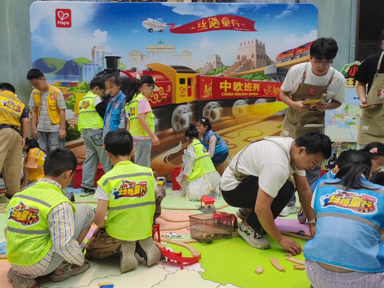 本次活动以寓教于乐为核心,巧妙地将历史知识与现代合作理念融入游戏环节。活动现场,一幅巨大的中欧地图铺展开来,成为了孩子们挥洒创意与智慧的舞台。活动伊始,孩子们在工作人员的指导下,分组协作,用小火车在地图上“修建”起连接中国与欧洲的“钢铁驼队”。从古都西安出发,经由河西走廊,跨越中亚山脉,直至欧洲的繁华都市,一条条蜿蜒的轨道不仅复刻了古老的丝路路线,更凝结了孩子们对地理知识的理解与团队协作的成果。