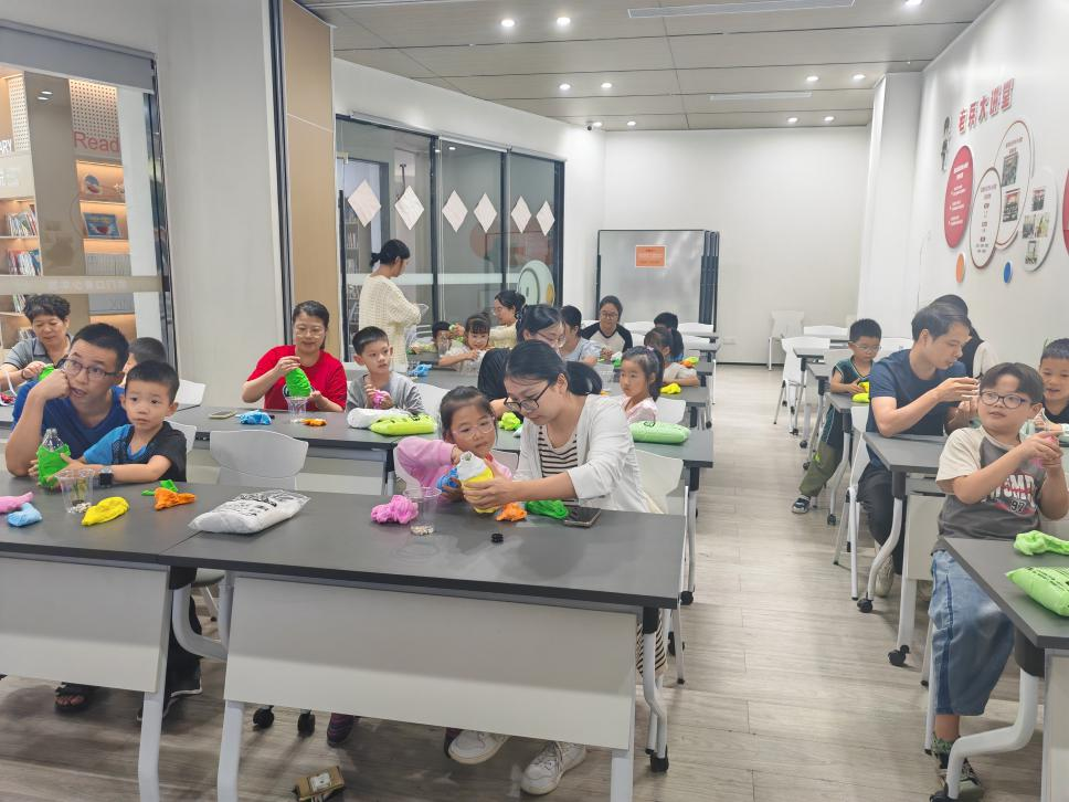 活动开始前,工作人员早已将瓶子整齐摆放在桌上,旁边的粘土区像打翻了调色盘,红、黄、蓝、绿等十余种颜色的粘土错落摆放,瞬间吸引了孩子们的目光。老师简单讲解创作思路后,亲子家庭便迫不及待地投入到创作中,现场很快沉浸在创意与协作的氛围里。
