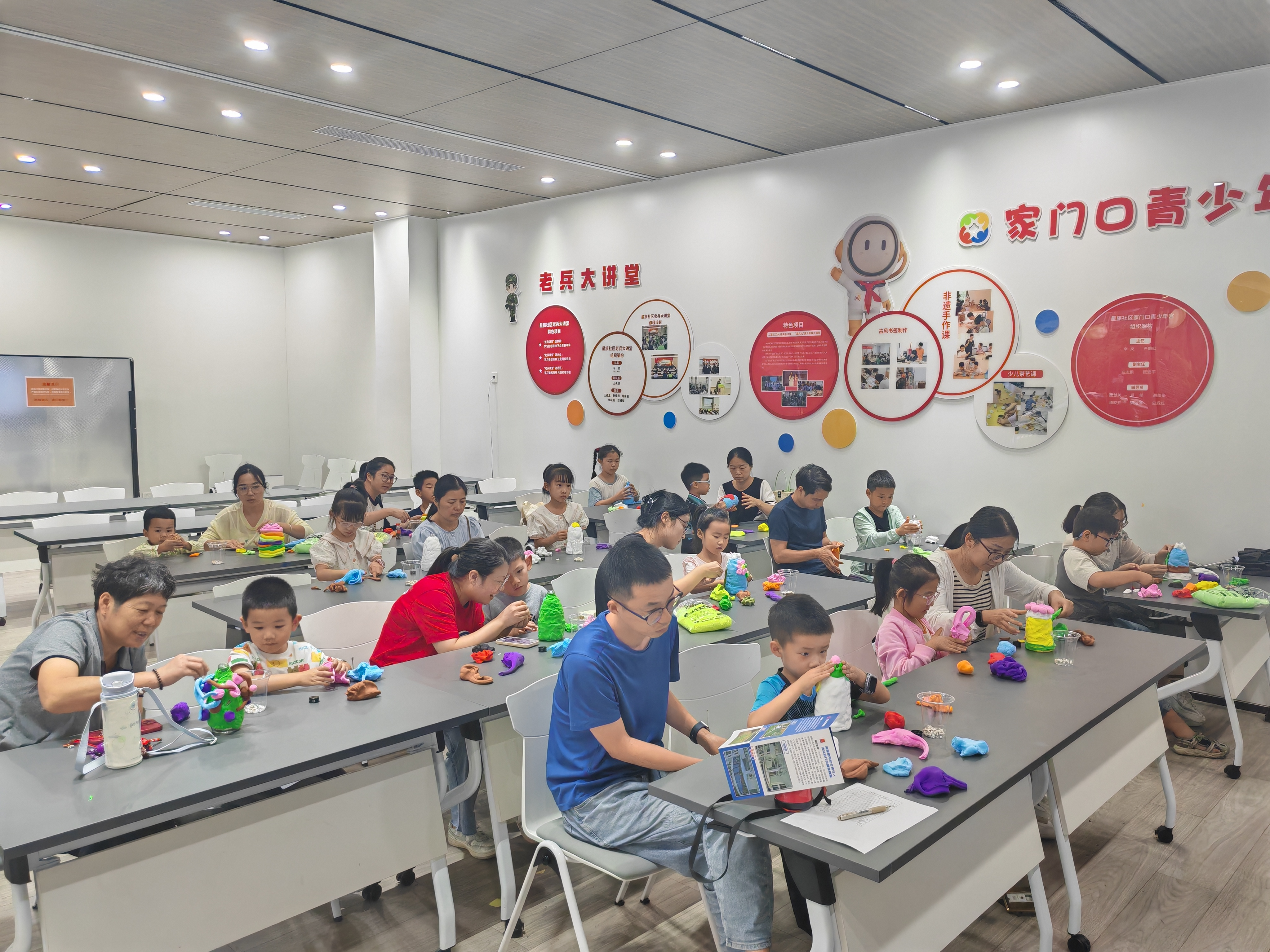 活动现场,家长与孩子围坐在一起,分工协作、默契配合,每一组家庭都在专注地将奇思妙想转化为手中的作品。有的家庭先低声讨论设计方案,孩子用小手比划着造型,家长则帮忙修整瓶身轮廓;有的则边尝试边调整,在揉捏粘土的过程中不断优化创意。大家时而低头专注塑形,时而互相交流技巧,温馨的互动画面在活动中心内随处可见。