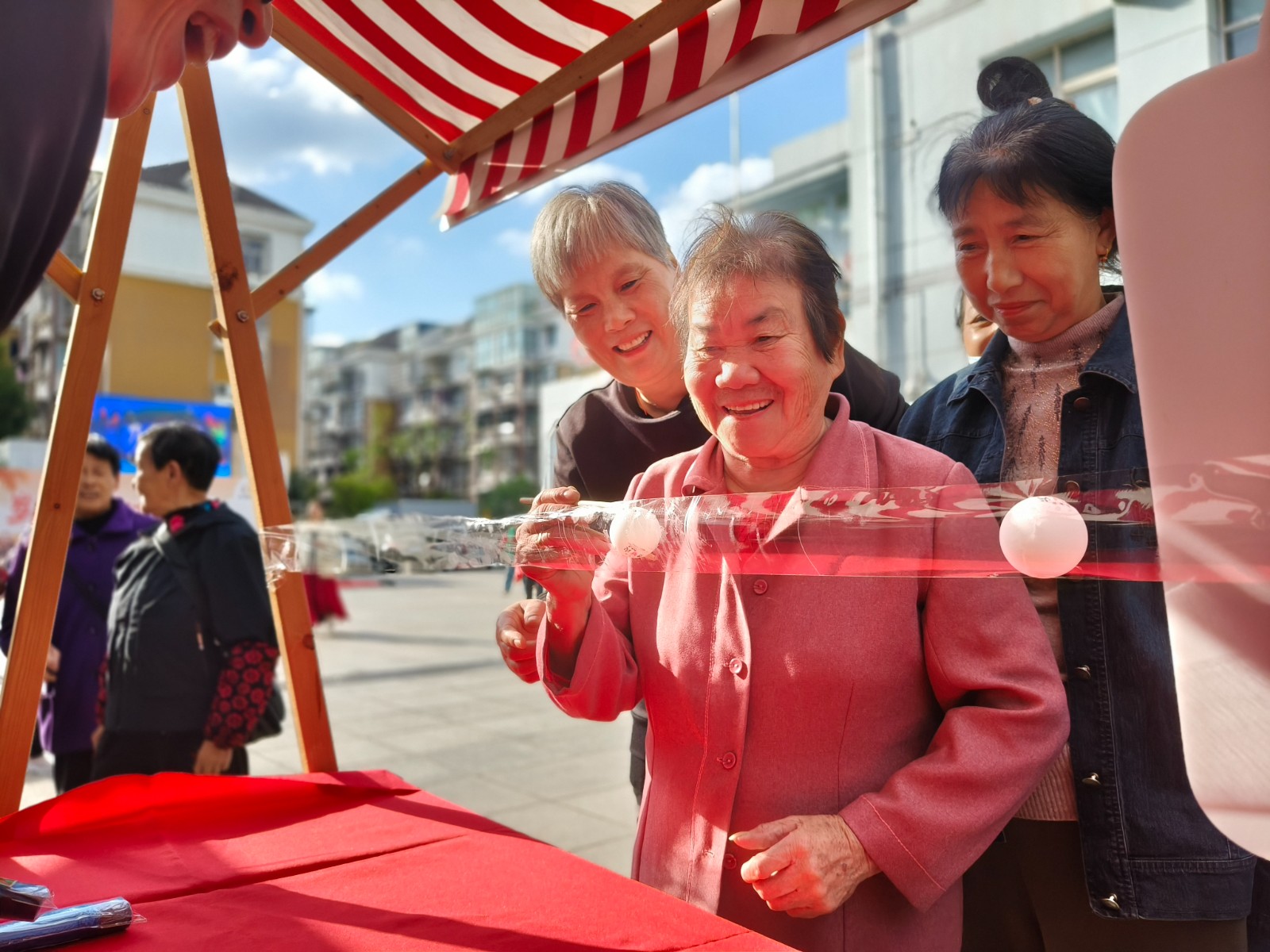 广场另一边的游园活动区同样热闹非凡,妙手摸秋、飞球入瓮、筷功夹豆等游戏区域,不时传来阵阵喝彩与欢笑。简单而富有趣味的小游戏,让长者们在竞技中重拾童真乐趣。