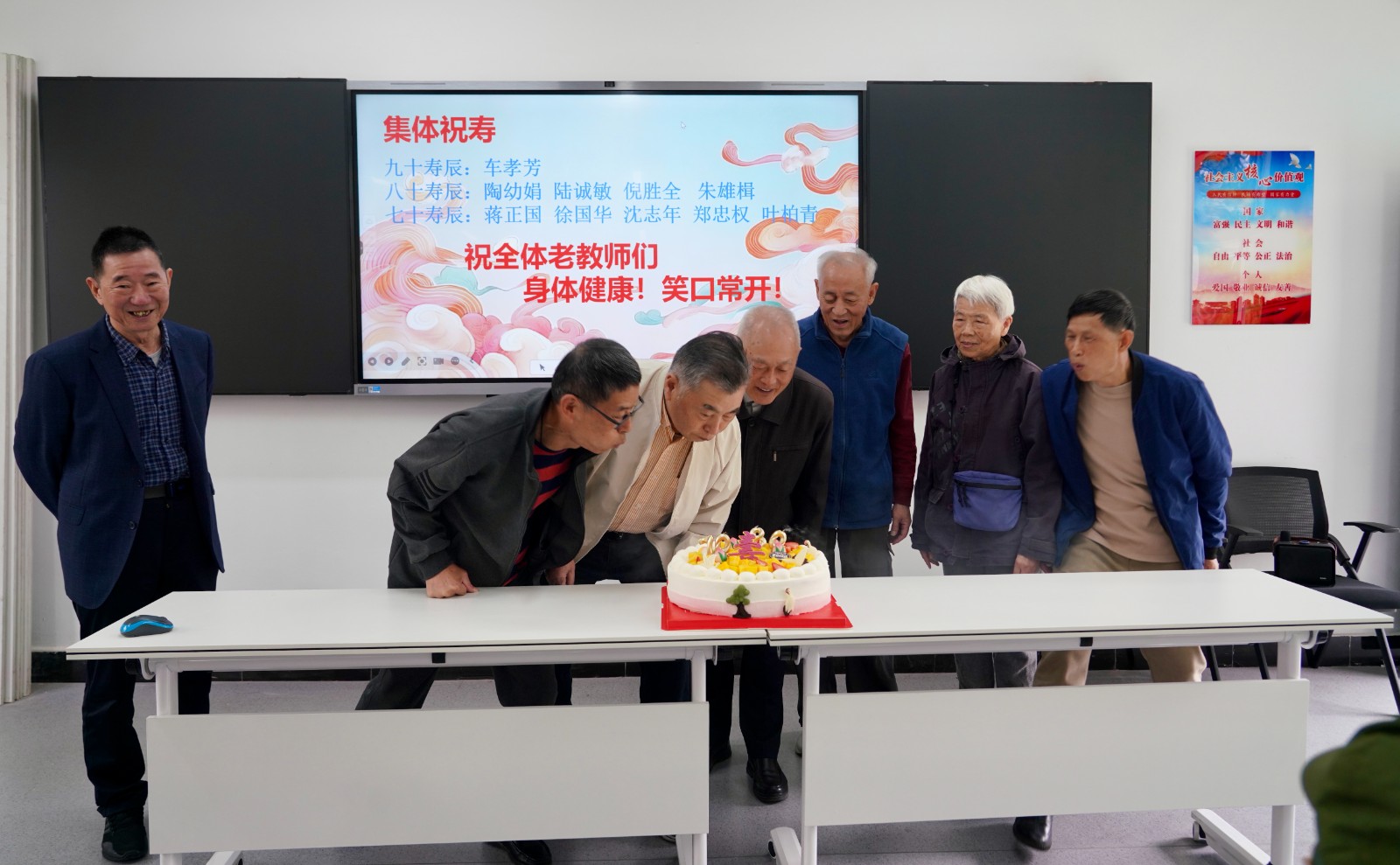 今年恰逢十位退休教师喜迎逢十寿辰,学院特意准备的集体祝寿环节,将本次活动推向高潮。伴随喜庆的《生日祝福歌》,寿星们在大家的祝福声中纷纷上台共同许愿吹灭蜡烛,全体老师一同分享生日蛋糕,掌声、笑声与真挚的祝福交织在一起,将此刻的温馨定格成永恒的记忆。