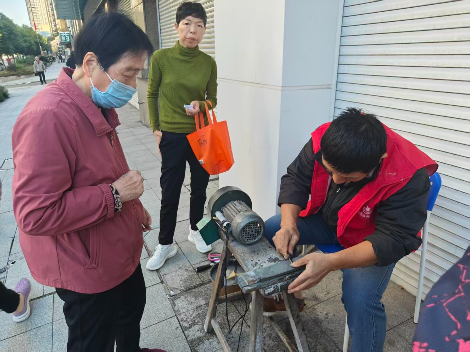 活动现场热闹有序,各类便民服务摊位前人气十足。志愿者为居民免费测量血压,细致叮嘱老年朋友注意饮食健康;修鞋师傅手法娴熟,缝补、粘胶、换鞋底,把居民的旧鞋修得焕然一新;理发志愿者耐心询问需求,剪发、吹发一气呵成,让大家清爽变身;磨刀师傅的砂轮滋滋作响,钝刀、锈剪经打磨后变得锋利如新。更受居民欢迎的是免费美食区,热气腾腾的关东煮香气四溢,香甜酥脆的爆米花供不应求,大人小孩吃得不亦乐乎。此外,志愿者还向居民普及反诈知识和垃圾分类要点,切实为居民排忧解难。