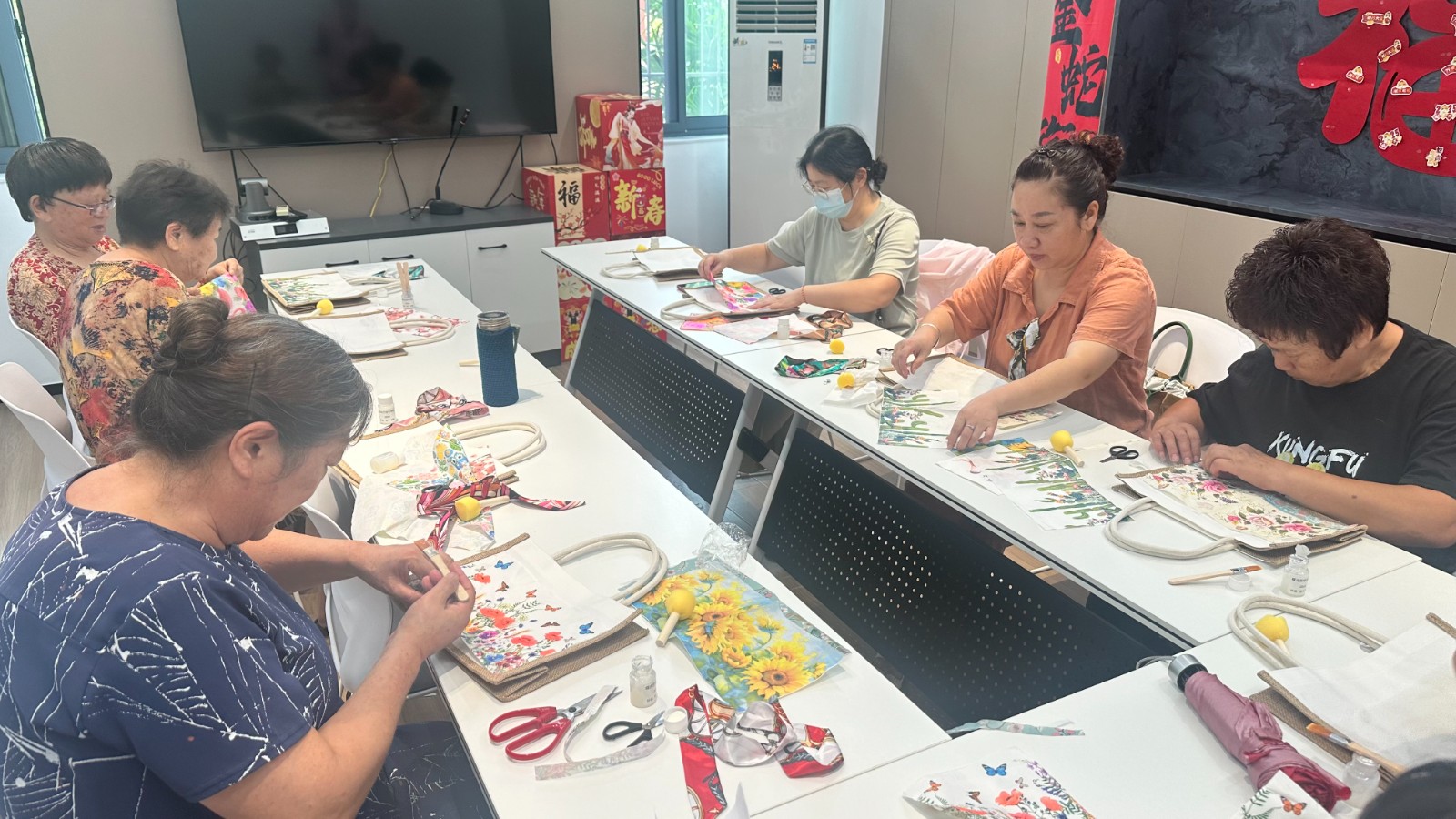 DIY环节,居民们瞬间化身为“设计师”,充分发挥自己的想象力和创造力。有的参照老师提供的卡通图案、花卉模板进行临摹;有的则自由创作,将心中的美好景象描绘在布袋上。大家时而低头专注勾勒,时而相互交流心得,活动现场充满了欢声笑语,气氛温馨而热烈。