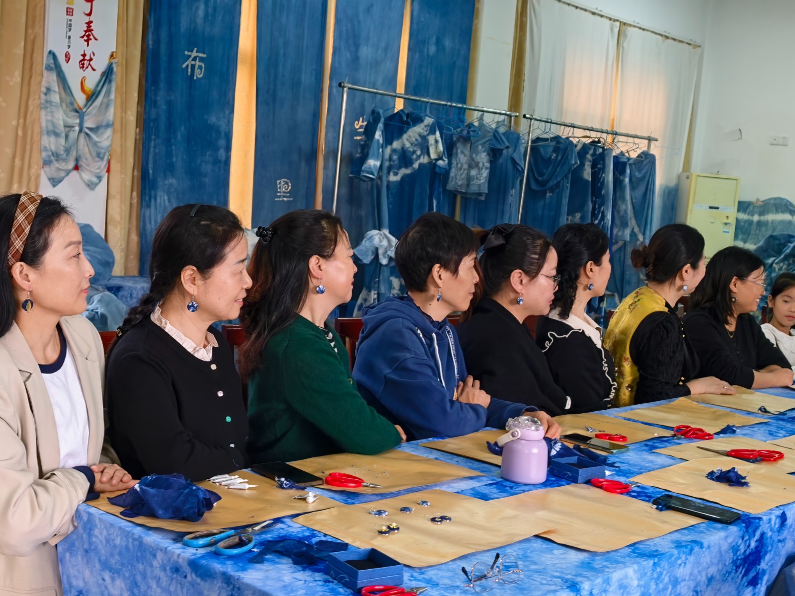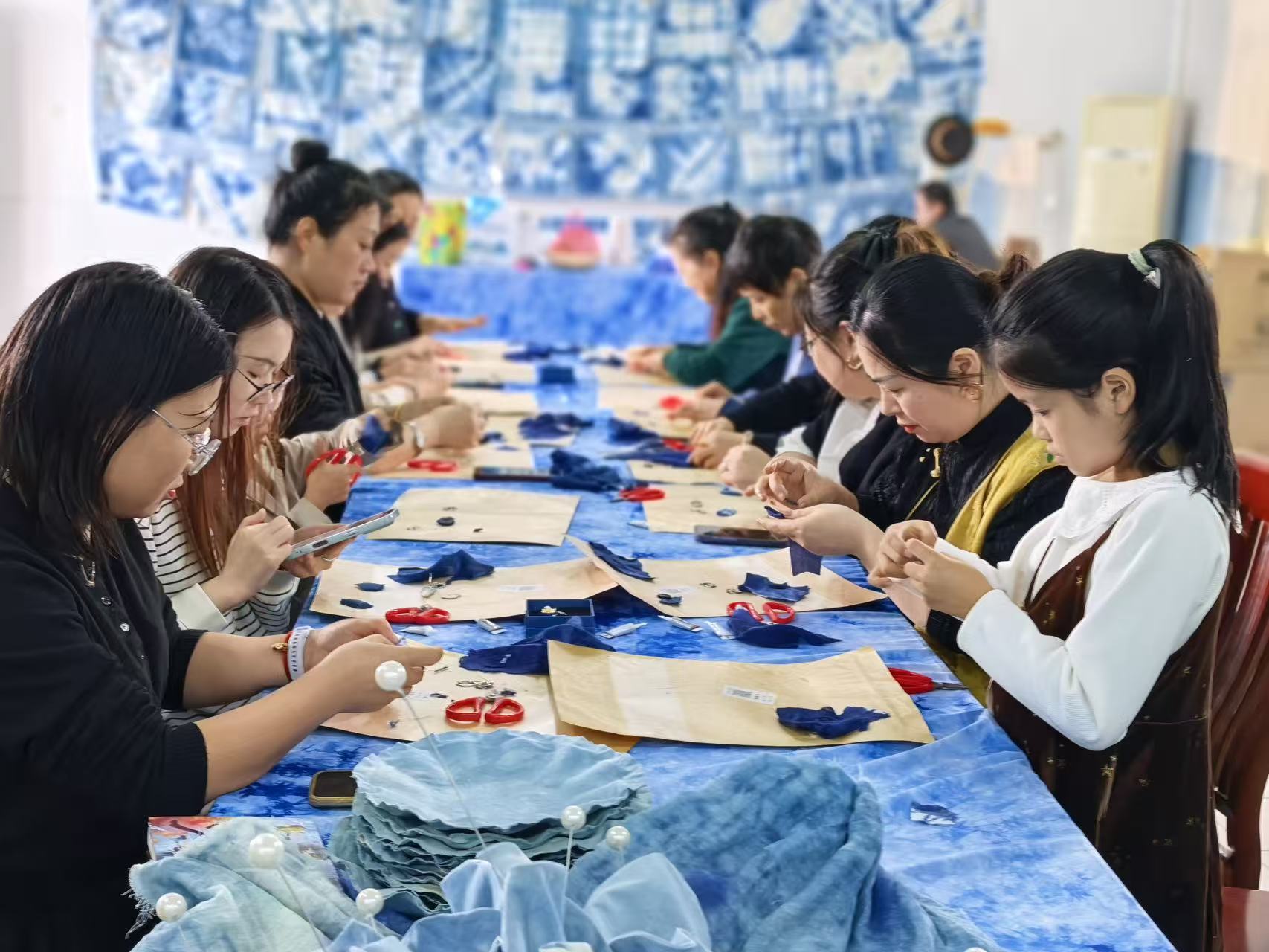 北仑区小港成校扎染社为实现扎染流动肌理与宋锦精致纹样融合,举办“宋锦扎染耳环创作”活动,邀请手作爱好者参与,解锁传统工艺新玩法。