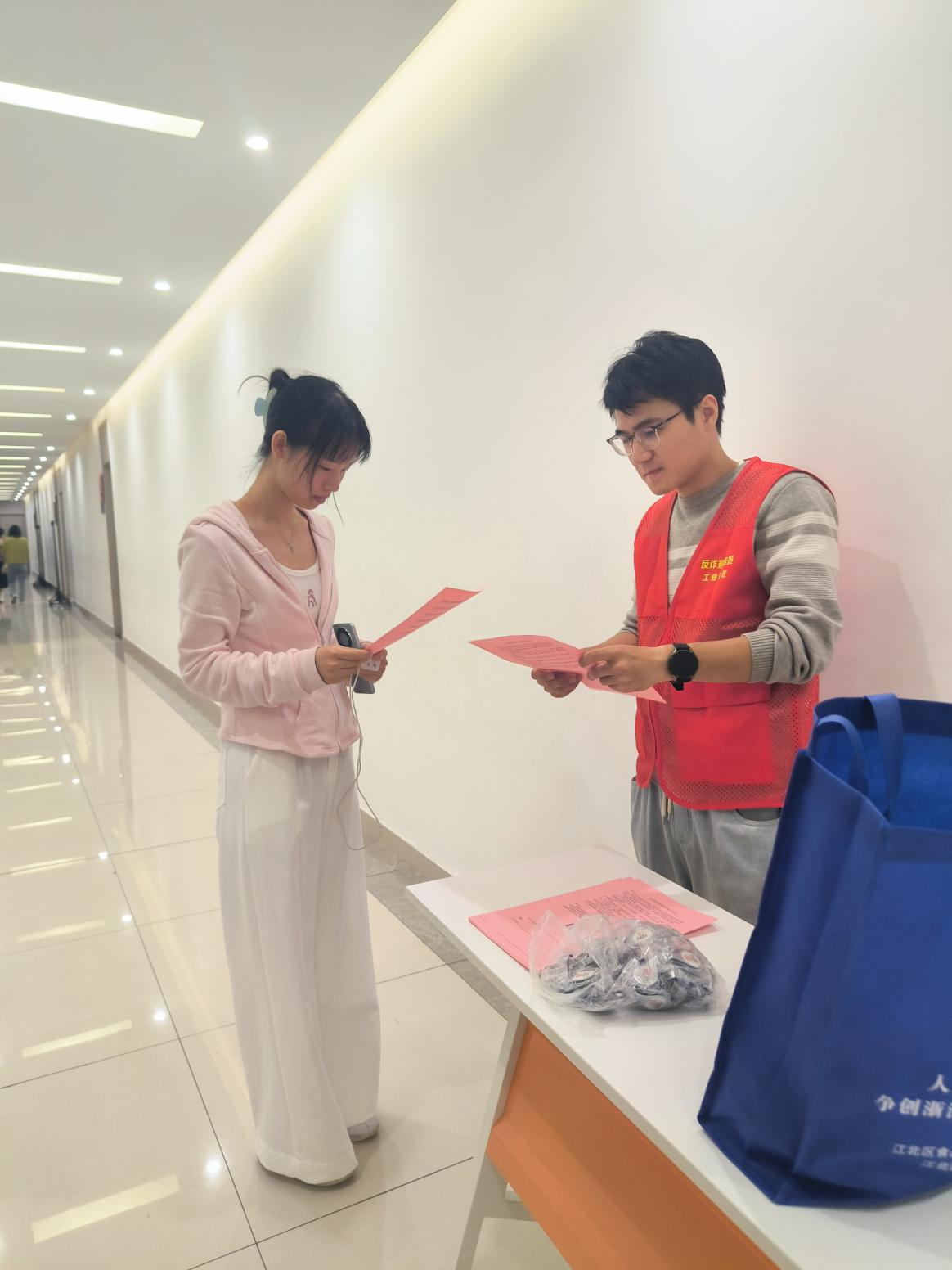 近日,在118工业社区“智工之家”公益课程间隙,一抹“志愿”活跃在课堂内外,为前来学习的职工们送上实用的反诈知识。