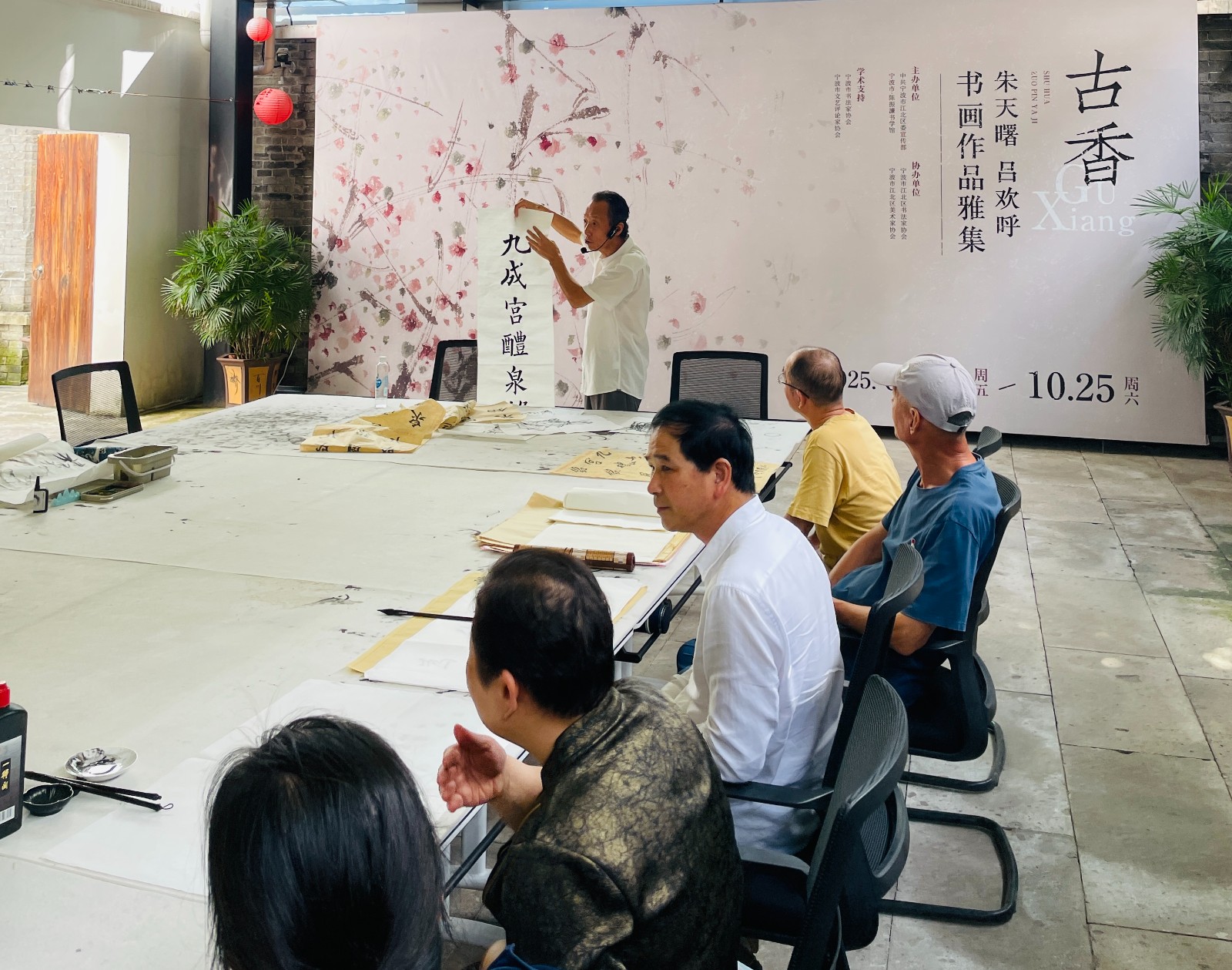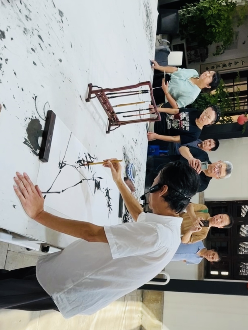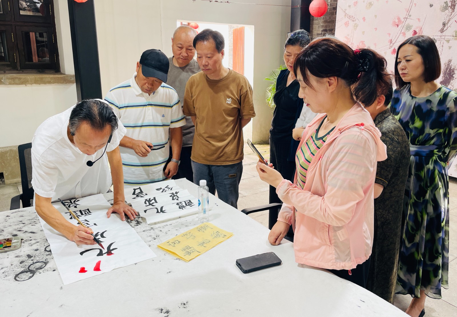 此次研学之旅不仅是一次艺术的沐浴,更是一次实践的磨砺。学员们在参观后围坐在桌前,樊老师开始细致点评他们的作业。尽管作品尚显质朴,但充满了对生活的热爱和对艺术的敬畏。樊老师耐心地指导学员们的笔法,学员们则认真地聆听,细致地观摩樊老师的示范。最后,樊老师即兴挥毫创作作品,如同太极般流畅,学员们目不转睛,连声赞叹。